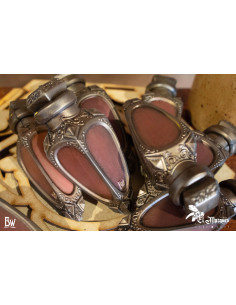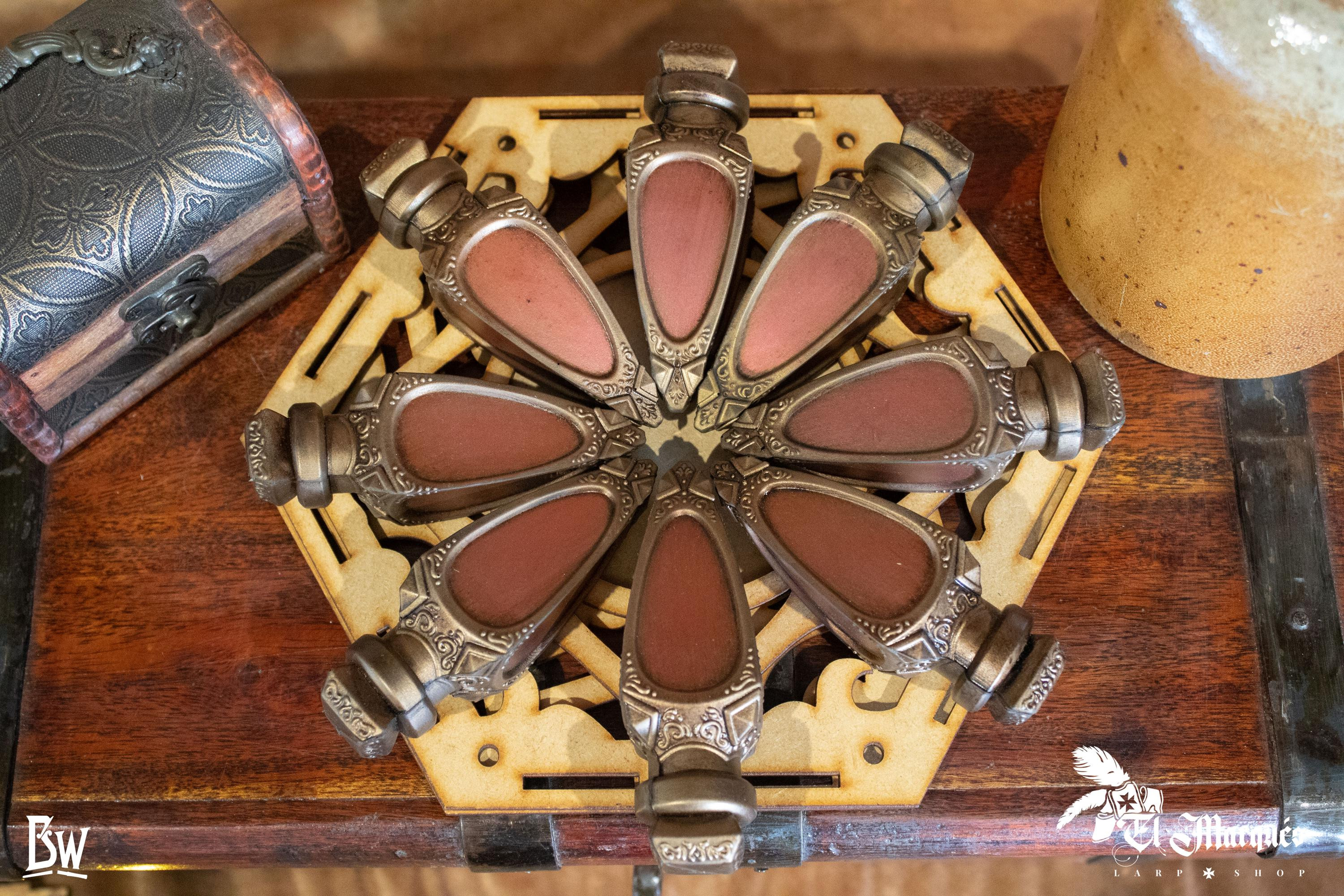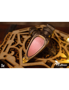 Fabricada com espuma de alta densidade, esta poção é leve, manobrável e completamente inofensiva ao impacto, fazendo com que cada lançamento seja preciso e seguro. Sua forma estilizada e alongada lembra os frascos de poções tradicionais, com um acabamento metálico em tom prateado e detalhes ornamentais em relevo que não só oferecem um toque autêntico, mas também se destacam em qualquer ambientação mágica. Além disso, o conteúdo de cor rosada no interior evoca místicos elixires de saúde ou poder.