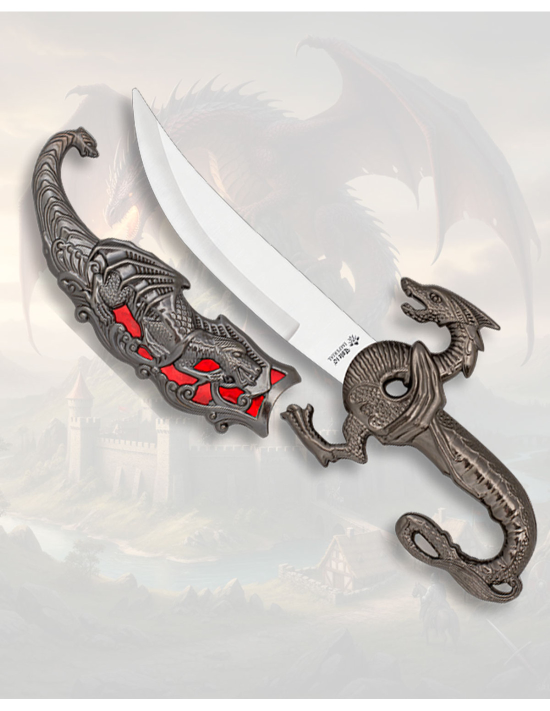 A bainha decorativa, trabalhada no mesmo tom escuro e rematada com um dragão em relevo e acentos em vermelho, protege a peça enquanto se torna um elemento de exibição por si só. Essa combinação de relevos e cor oferece um contraste chamativo, ideal para quem busca um objeto que se destaque em uma coleção ou complemente uma indumentária temática.