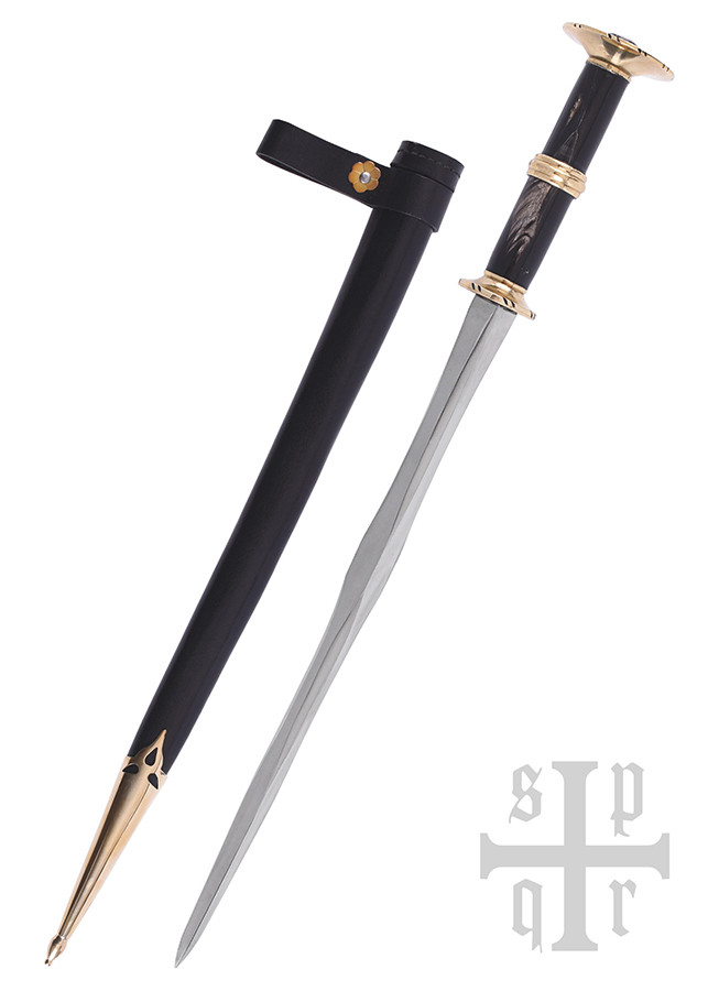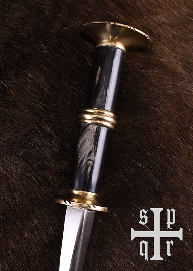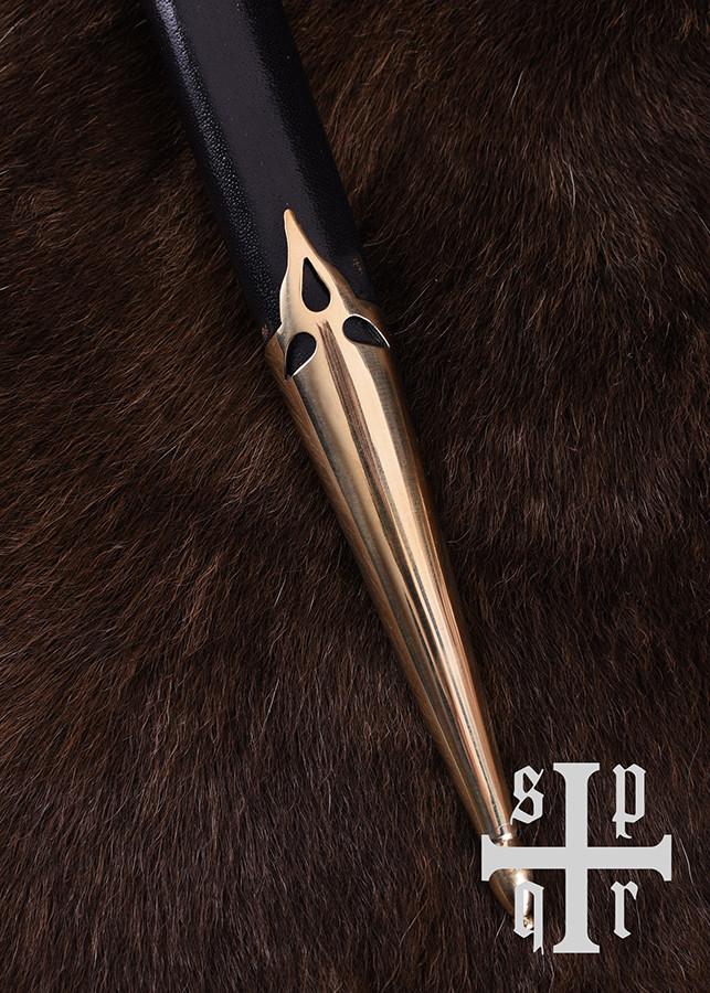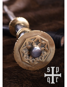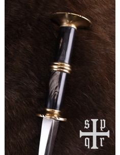 Esta bela arma corpo a corpo medieval tardia é baseada no final do século XIV e início do século XV. exemplos originais da Alemanha. Conhecido como punhal rondel ou punhal redondo, deve seu nome à forma plana e circular característica de sua guarda e pomo. Este tipo particular de punhal foi amplamente utilizado no final da Idade Média e continuou a desfrutar de grande popularidade até o Renascimento. Aparecendo em muitas variações, era usado por pessoas de todas as esferas da vida, de camponeses e comerciantes a Landsknechte ou cavaleiros fortemente armados. Dado seu design particular, a adaga rondel oferecida aqui é na verdade, para ser exato, um Panzerbrecher ou Panzerstecher (que literalmente se traduz em quebra-armadura ou perfurador de armadura), uma arma de empurrão desenvolvida especificamente para uso em combate corpo a corpo. Como o próprio nome indica, esta arma portátil única foi projetada exclusivamente para perfurar armaduras acolchoadas e cota de malha ou esfaquear o oponente através das costuras de sua armadura de placas. Caracterizava-se por uma lâmina muito rígida que geralmente não tinha arestas de corte, mas em vez disso afunilava em uma ponta afiada.