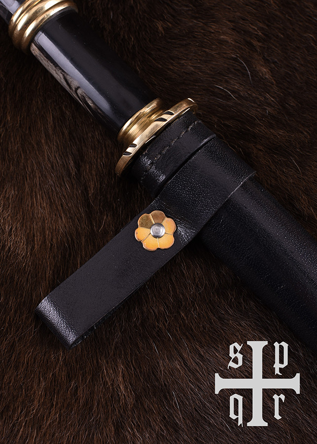 A adaga vem completa com uma bainha de couro tingida à mão com uma sobreposição de latão e uma presilha para cinto. O tom de preto pode variar um pouco de peça para peça devido ao tingimento manual.