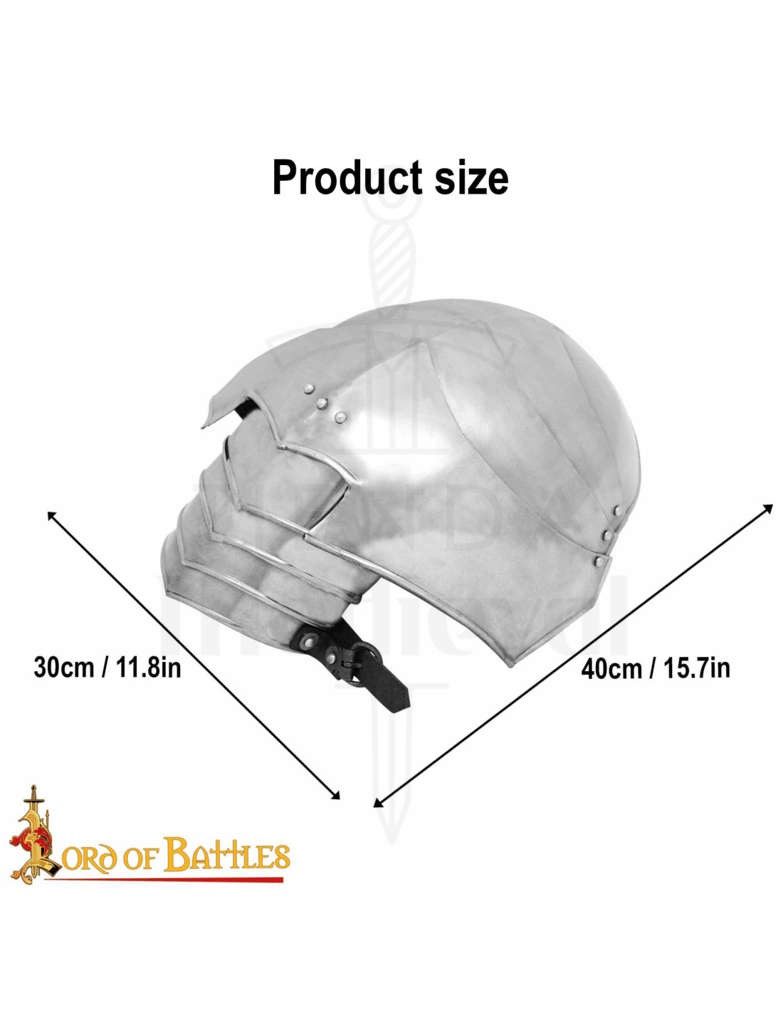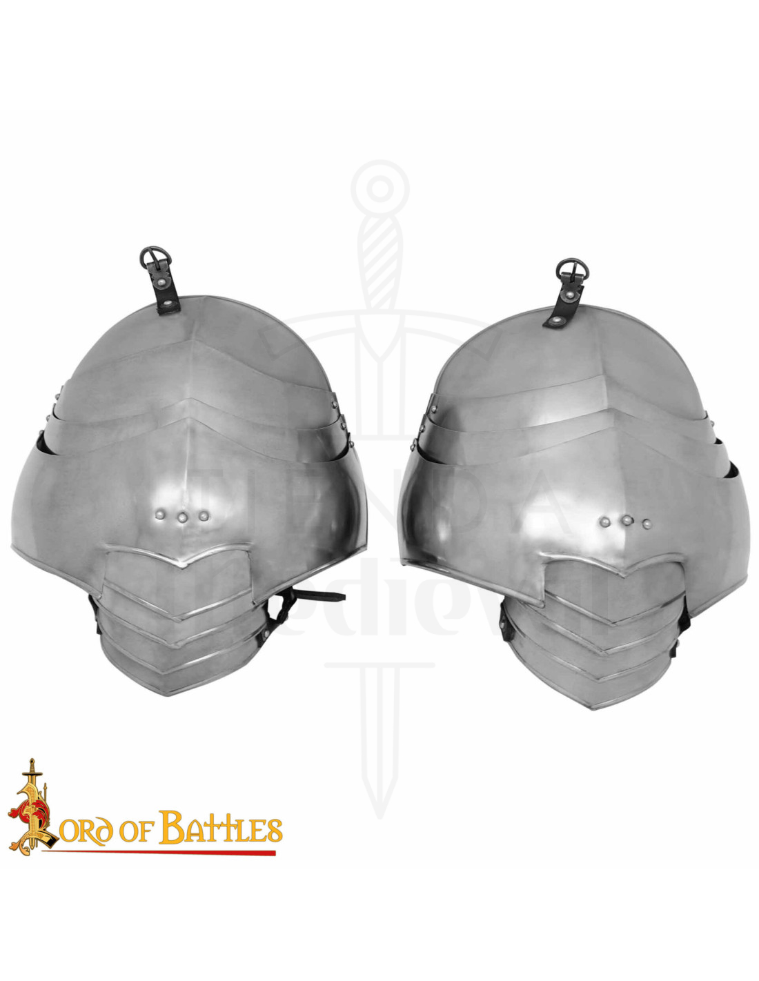 Nas imagens, pode-se observar um capacete metálico composto por placas articuladas, com acabamento prateado polido e detalhes funcionais como rebites e dobradiças, elementos que refletem a atenção aos detalhes deste tipo de peças. Essa mesma abordagem na fabricação se traduz em omoplatas que combinam estética histórica e movimento natural, ideais para posar, lutar de forma recriada ou completar um traje de exposição.