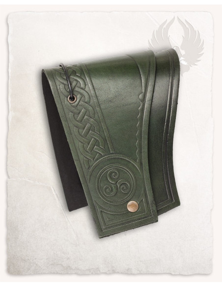 O acabamento em couro verde escuro, com uma pátina trabalhada, confere profundidade e caráter a cada peça, enquanto o interior em tom natural oferece um contato mais suave com a pele para uso prolongado. O relevo com nós celtas e o triskle central realçam a personalidade do conjunto, adicionando um ponto focal que é apreciado tanto de perto quanto a distância. Um acabamento definido e um pequeno rebite metálico reforçam o contorno, somando detalhe visual e sensação de autenticidade.