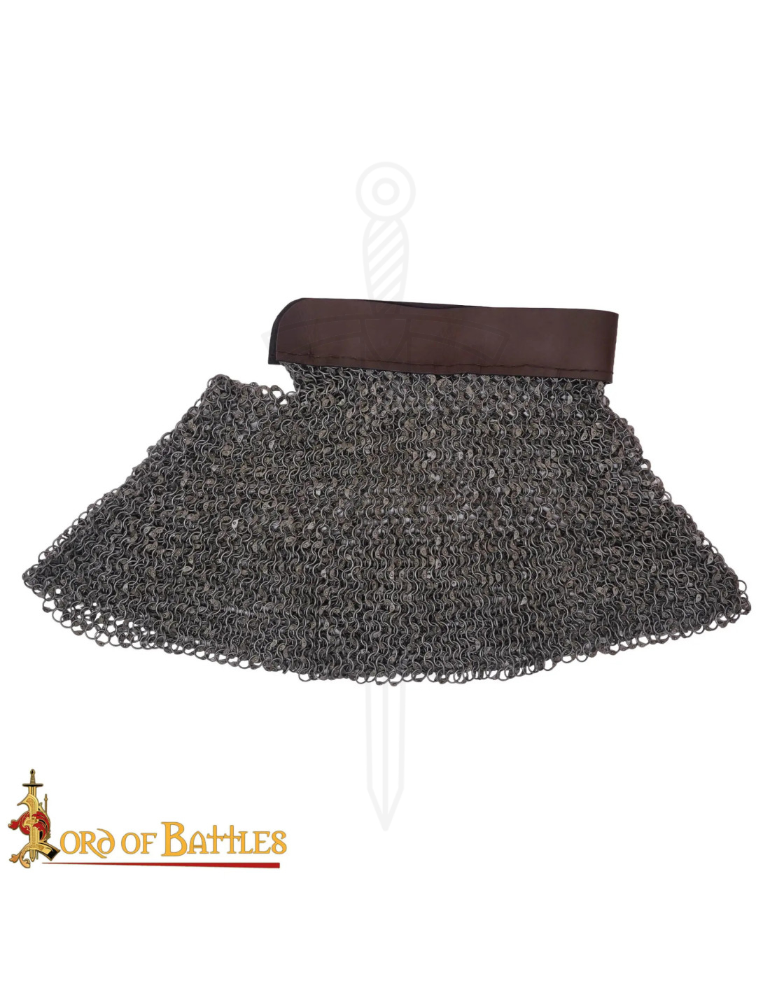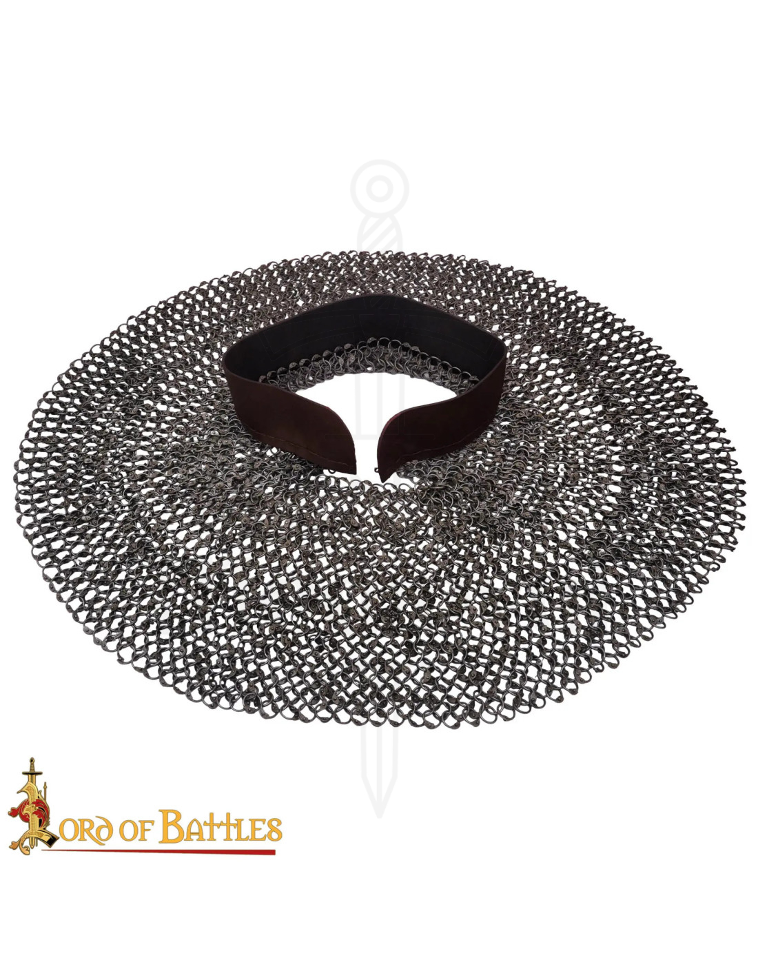 Esta gargantilha combina uma estética autêntica com vantagens práticas: a malha de anéis rebitados oferece flexibilidade para olhar, girar e combater, enquanto a banda de couro real na base garante um ajuste confortável e evita atritos. O acabamento escuro e fosco dá um aspecto sóbrio que complementa e realça capacetes e cotas, perfeito tanto para recriações históricas como para treinos ou representações.