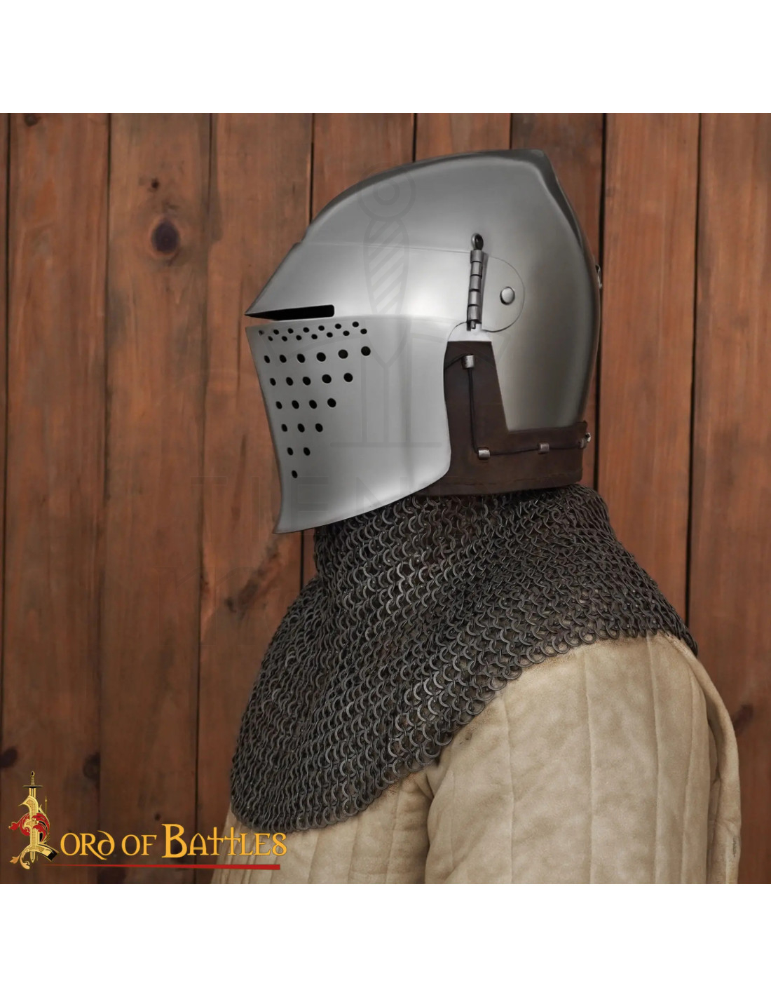 Projetada para cobrir a garganta, ombros e parte superior do peito, facilita a integração com gambesões ou kits completos, mantendo a mobilidade necessária para técnicas de combate e deslocamentos. Sendo montada com padrão tradicional 4-em-1 e rebites redondos, oferece uma sensação de solidez e autenticidade visual que distingue seu equipamento de qualquer peça genérica.