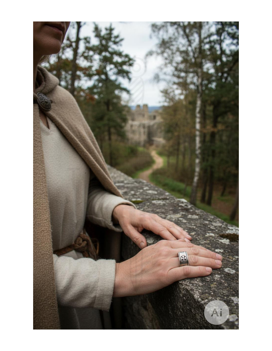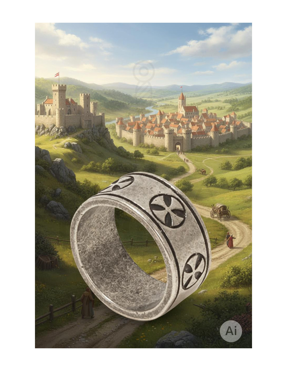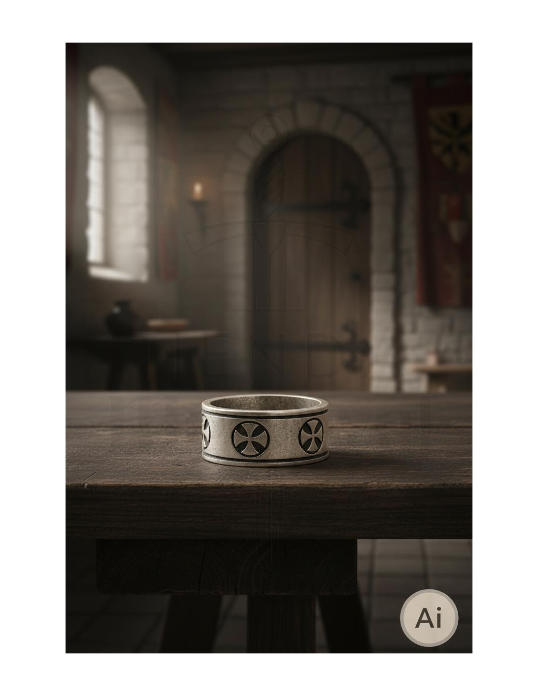 Este anel é feito de metal de alta qualidade com acabamentos em prata antiga, conferindo-lhe um aspecto autêntico e medieval. Seu design único e detalhado mostra as cruzes emblemáticas dos Cavaleiros Templários, símbolo de bravura e honra.