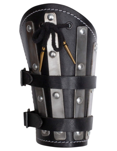 Além disso, essas mangas de cota de malha são enfeitadas com acabamento de couro elegante, adicionando um toque de estilo e distinção à sua armadura. Seu fecho de fivela frontal permite um ajuste rápido e seguro, para que você esteja pronto para a ação em questão de segundos.
