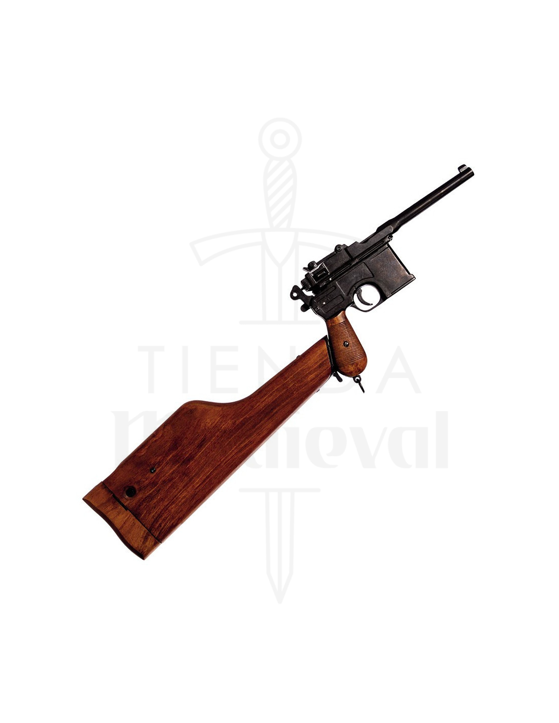 Descubra a réplica da icônica pistola C96, projetada por Mauser na Alemanha em 1896 e usada na Primeira e na Segunda Guerra Mundial. Esta impressionante peça de colecionador é uma reprodução fiel do original, fabricada com materiais de alta qualidade pela renomada empresa espanhola Denix.