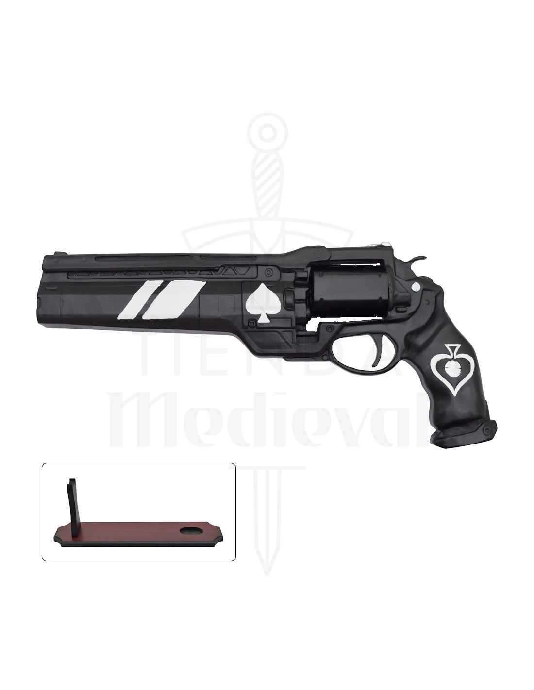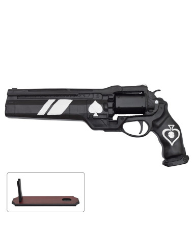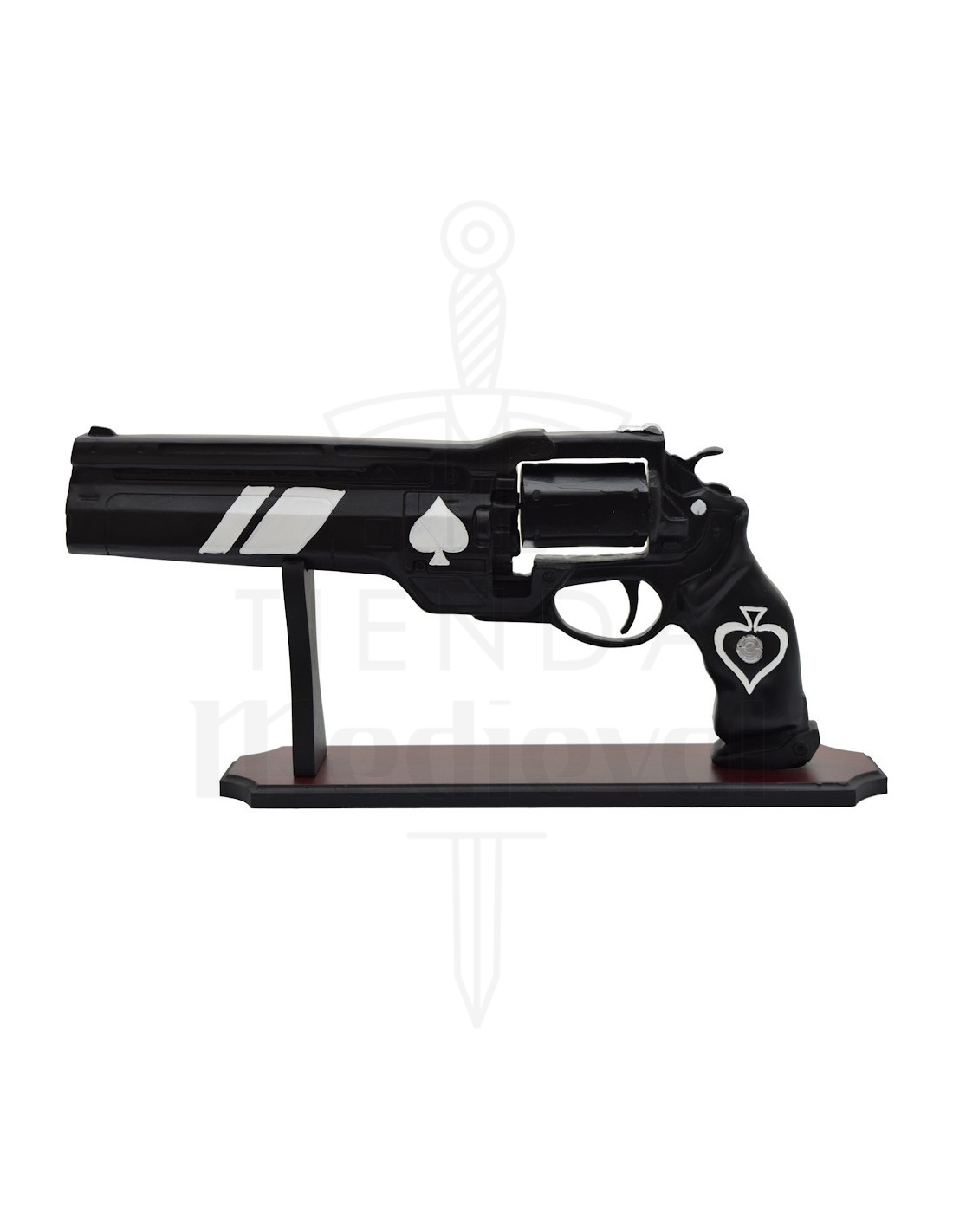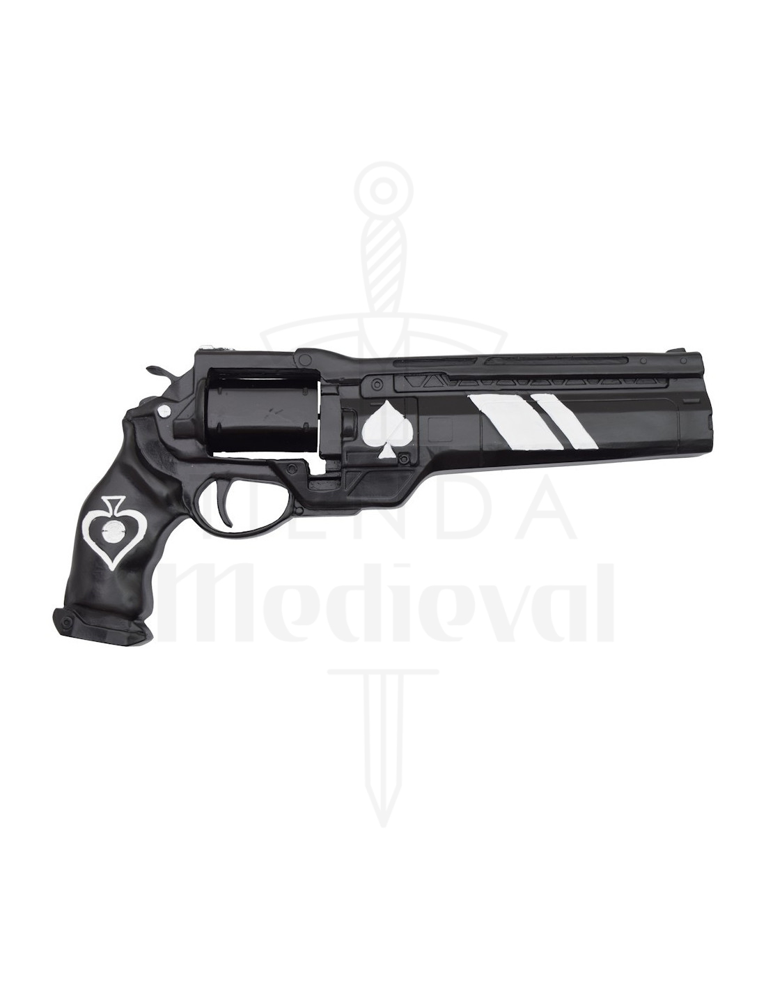 Esta peça ornamental recria o espírito do famoso revólver de fantasia, com um acabamento negro intenso e detalhes pintados em branco que realçam o símbolo da carta de espadas e o pequeno emblema na empunhadura, como uma chama coroada, que lhe dá caráter e personalidade. O cilindro, o gatilho e o martelo estão esculpidos para preservar a estética clássica do design, enquanto a aparência geral mantém a segurança e a tranquilidade de uma réplica não funcional, ideal para exposição em prateleiras, paredes ou cantos temáticos.