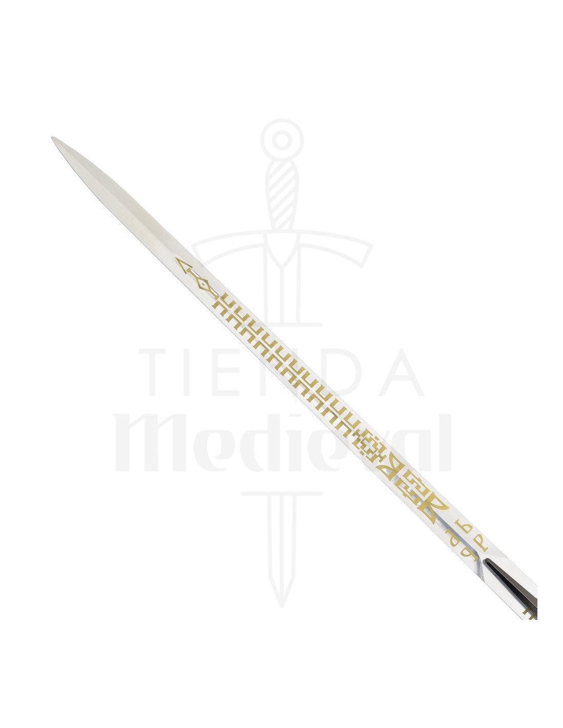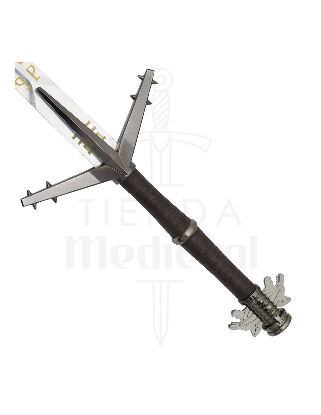 A lâmina metálica reflete a luz com um acabamento polido e exibe inscrições douradas que atraem o olhar, trazendo uma sensação de nobreza e mistério. Essa decoração não é apenas estética, mas transmite a sensação de uma espada com caráter, perfeita para quem busca uma réplica com presença para exibir ou recriar cenas com realismo.