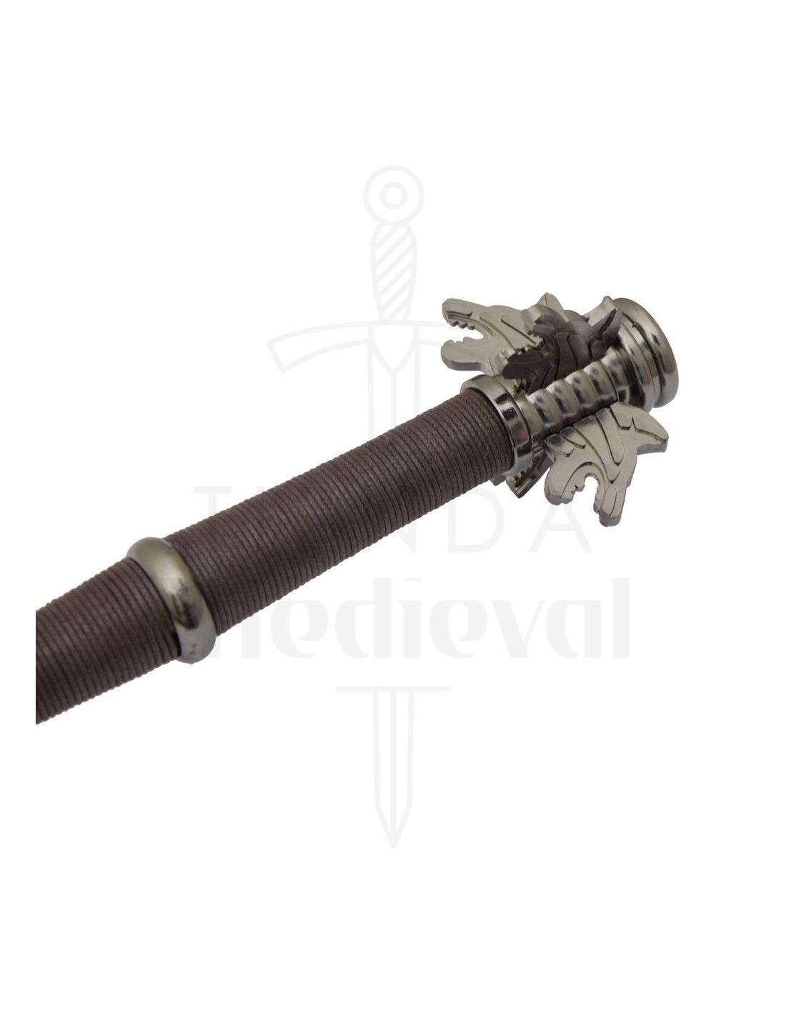 O design da guarda, com suas protuberâncias angulares, e o pomo trabalhado, oferecem uma pegada segura e confiança ao manuseá-la, enquanto o cabo envolvido em um material escuro melhora a aderência, evitando deslizamentos e facilitando movimentos controlados. O equilíbrio entre lâmina e empunhadura permite uma manipulação fluida, pensada para quem aprecia tanto a estética quanto a experiência tátil.