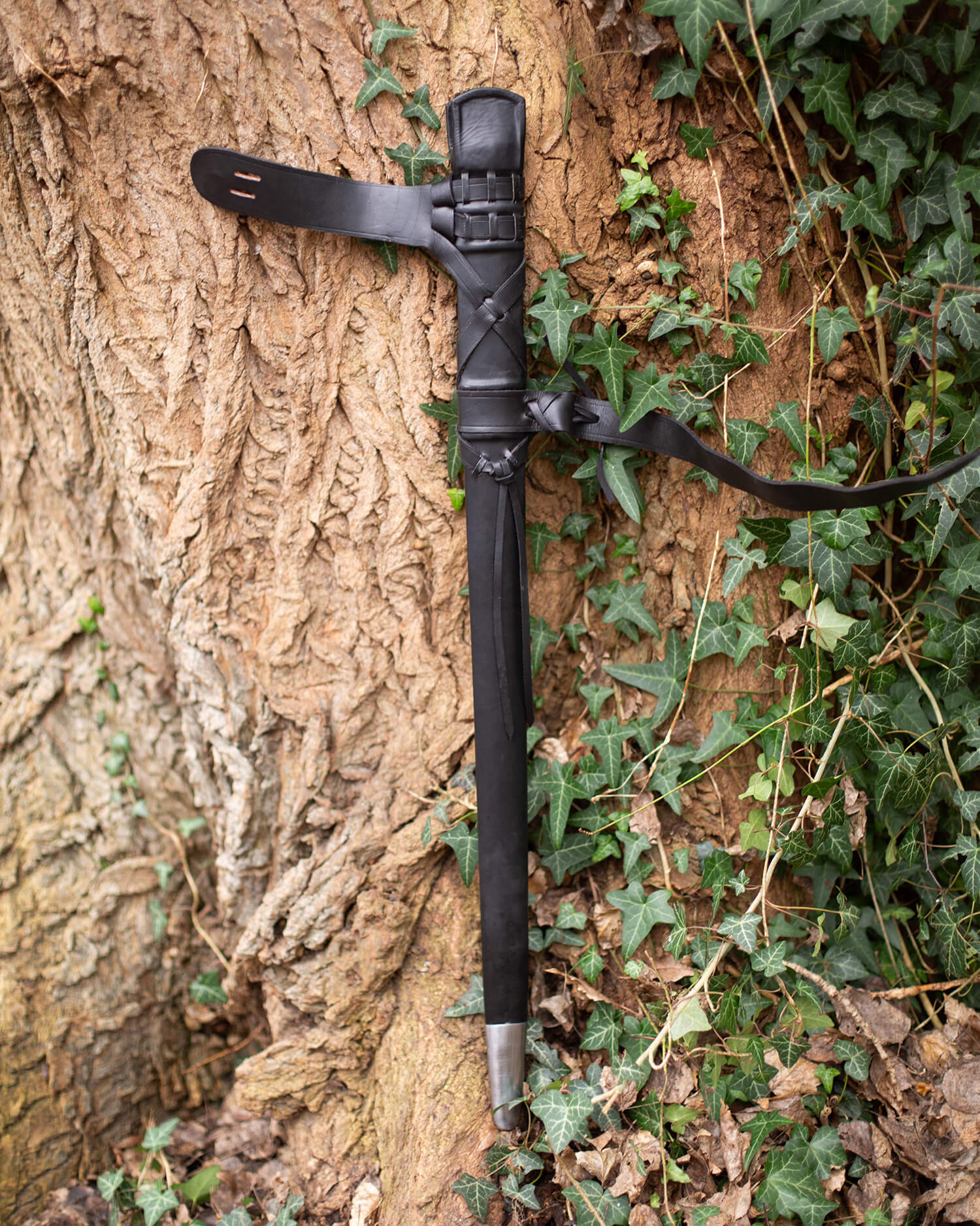A capa combina um núcleo de madeira envolto em couro, resultando em uma silhueta que mantém sua forma, protege a lâmina e transmite uma sensação de robustez sempre que você a segura. Na imagem, pode-se apreciar couro escuro que realça as correias e confere à peça uma aparência sóbria e trabalhada, perfeita para quem busca uma estética cuidada sem abrir mão da funcionalidade.