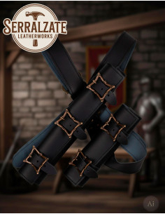 Descubra o **Dobre suporte de espadas com cinto para LARP** da Serralzate LeatherWorks, uma obra-prima artesanal projetada especialmente para quem busca qualidade, funcionalidade e estilo. Fabricado em couro resistente e com fivelas de metal com acabamento em bronze envelhecido, este sistema de correias é o aliado perfeito para suas aventuras ao vivo. Seu design simétrico permite carregar confortavelmente duas espadas, cada uma em sua própria bainha, proporcionando acesso rápido e seguro durante os eventos.