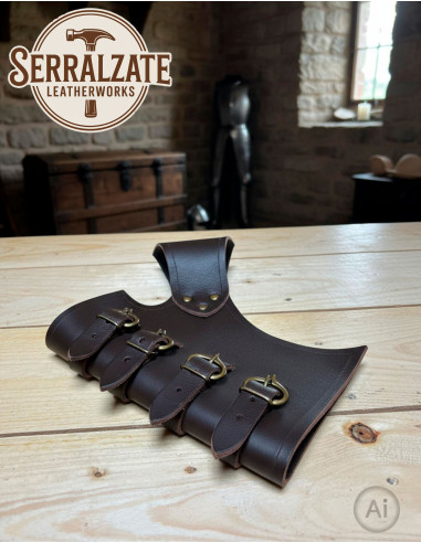 Você procura um portaespadas que combine funcionalidade e estilo medieval? Este tahalí Jacan, feito em couro marrom escuro de alta qualidade, oferece uma solução robusta e adaptável para suas aventuras. Seu design conta com quatro tiras que permitem ajustar com precisão diferentes espessuras de espada, garantindo uma pegada segura e confortável o tempo todo.