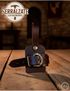 Seu tamanho pequeno e ajustável a torna ideal para pendurar no cinto, espada ou adaga, adaptando-se perfeitamente à espessura da lâmina graças a uma tira com fivela que permite regular sua largura sem complicações. Isso garante que suas armas fiquem firmemente presas e facilmente acessíveis a qualquer momento.