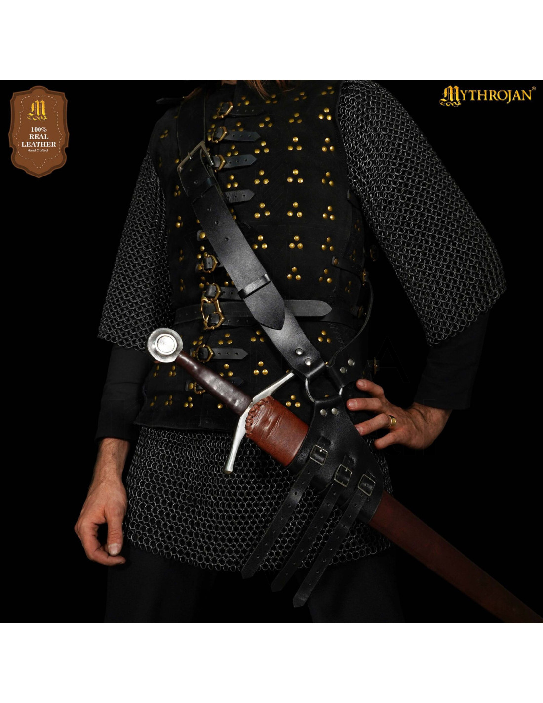 Desenhado em couro genuíno acabado em preto, oferece uma estética fiel e elegante que realça qualquer traje histórico ou de recreação. O couro foi trabalhado à mão nas bordas, o que confere um aspecto refinado e uma sensação agradável ao toque, sem sacrificar a resistência necessária para um uso contínuo.