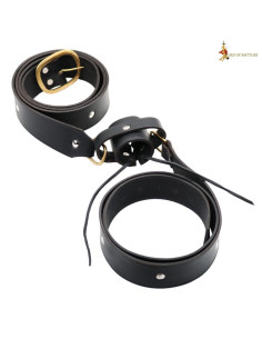 O design reúne uma correia principal e duas correias adicionais mais curtas, pensadas para ajustar de forma prática tanto espadas como acessórios ou capas. Os rebites circulares e a fivela oval dourada não só aportam caráter visual, mas reforçam pontos-chave para uma fixação segura, permitindo movimentos fluidos sem perda de ajuste. As laçadas e orifícios facilitam a adaptação a diferentes conjuntos e posturas sem complicações.