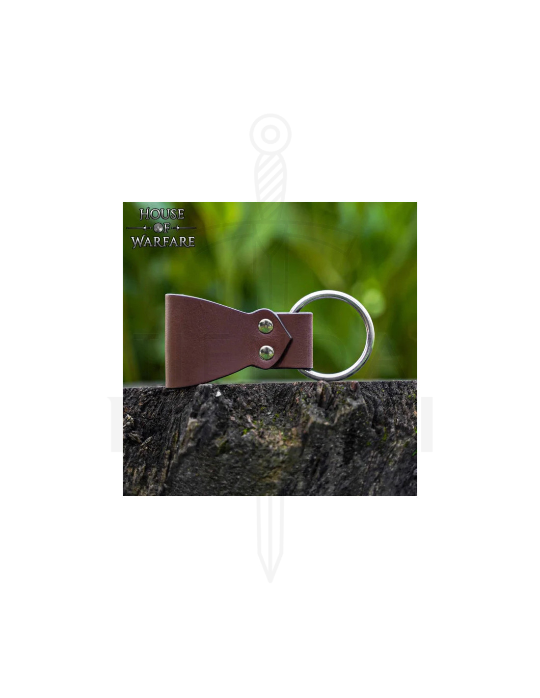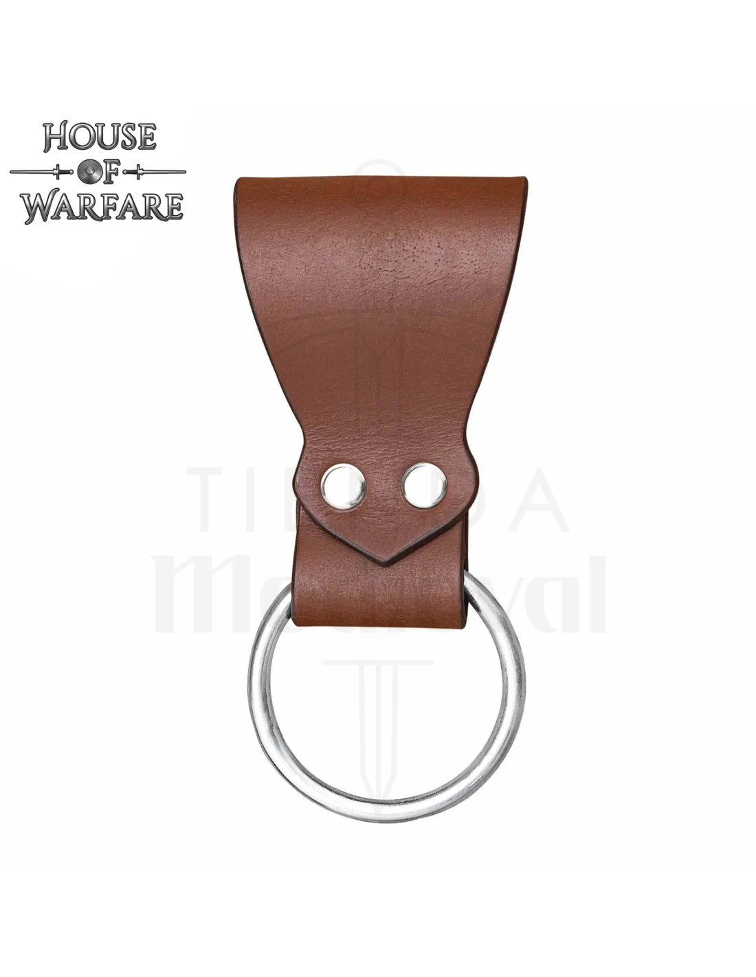 Esse acessório combina couro marrom de qualidade, que pode ser couro genuíno ou uma alternativa sintética bem trabalhada, com um aro metálico prateado sólido rebocado para maior resistência. A peça apresenta uma paleta quente e acabamentos artesanais, com a pele dobrada e fixada por dois rebites visíveis, conferindo um ar clássico e robusto ao seu equipamento.