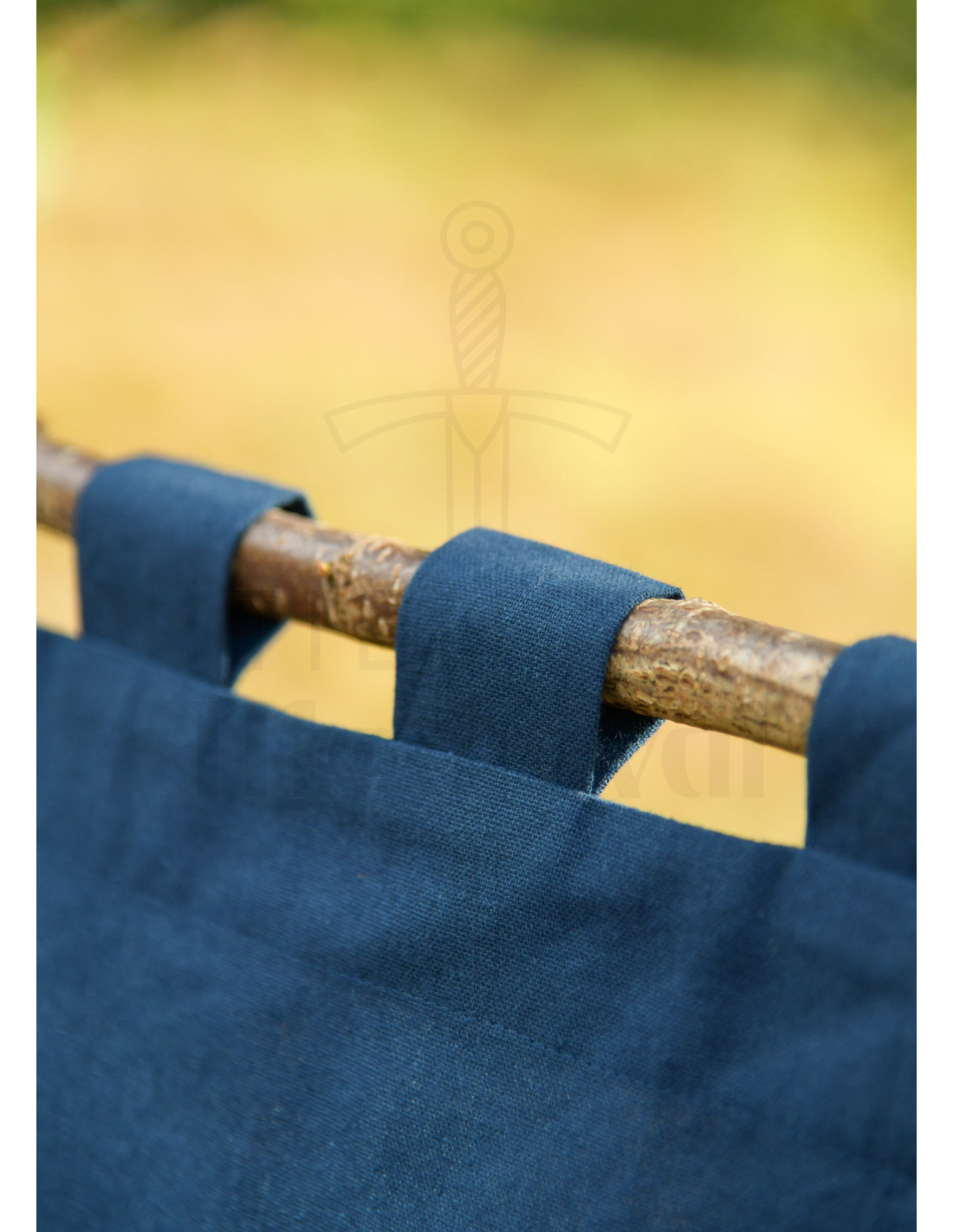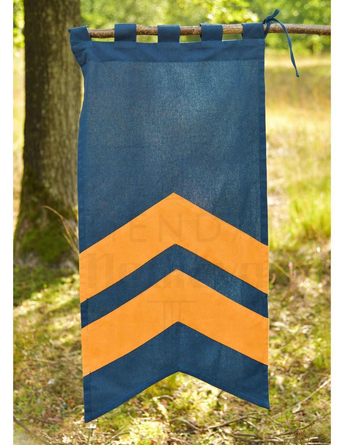 Com uma base em azul profundo e duas faixas em 'V' em tom quente, este estandarte oferece uma presença visual poderosa, capaz de transformar qualquer espaço em foco de atenção. A forma pontilhada na parte inferior segue o contorno das faixas, proporcionando um acabamento elegante que cai com graça, enquanto o tecido 100% algodão traz textura natural e movimento, perfeito para exibir em interiores temáticos ou em eventos ao ar livre com caráter.
