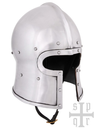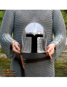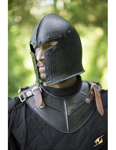 Além disso, seu design fiel aos modelos históricos o transportará para a época do Renascimento italiano. Cada detalhe foi cuidadosamente recriado para lhe proporcionar uma experiência autêntica. Sem dúvida, este barbute italiano será o complemento perfeito para seus trajes e fará de você o centro das atenções em qualquer evento, seja um festival medieval ou uma convenção de CosPlay.
