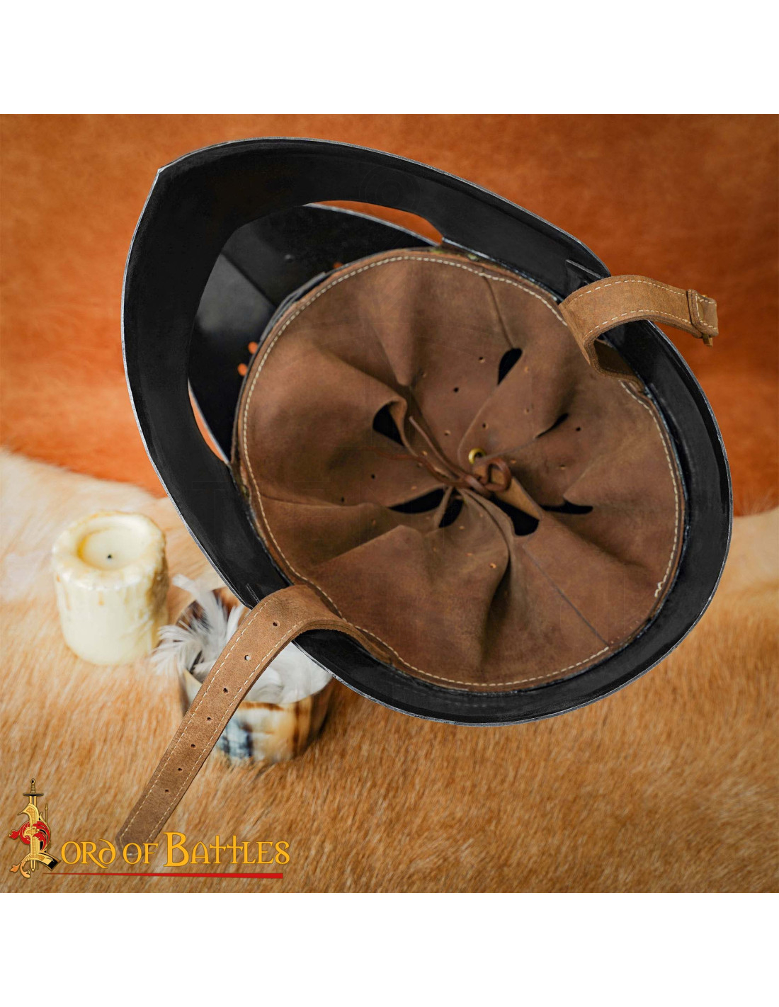O acabamento ennegrecido e o conjunto de rebites visíveis criam uma estética robusta e autêntica, perfeita para quem busca fidelidade histórica. A silhueta alongada em direção à nuca não só reforça a proteção, mas também realça a presença cênica ao usá-lo em eventos ou exposições.