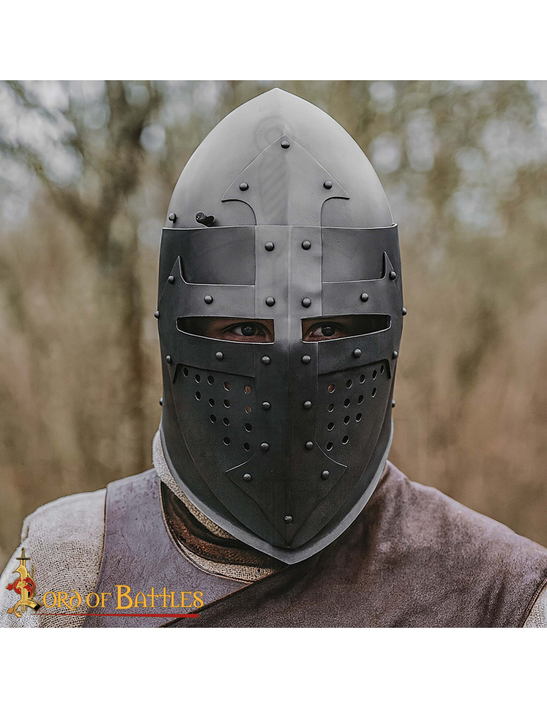 Este design reproduz fielmente a evolução militar dos séculos XIV e início do XV, uma época em que os guerreiros procuravam capacetes que desviassem golpes e protegessem o rosto sem obstruir a visão, influenciando diretamente o aspecto icônico que hoje reconhecemos.