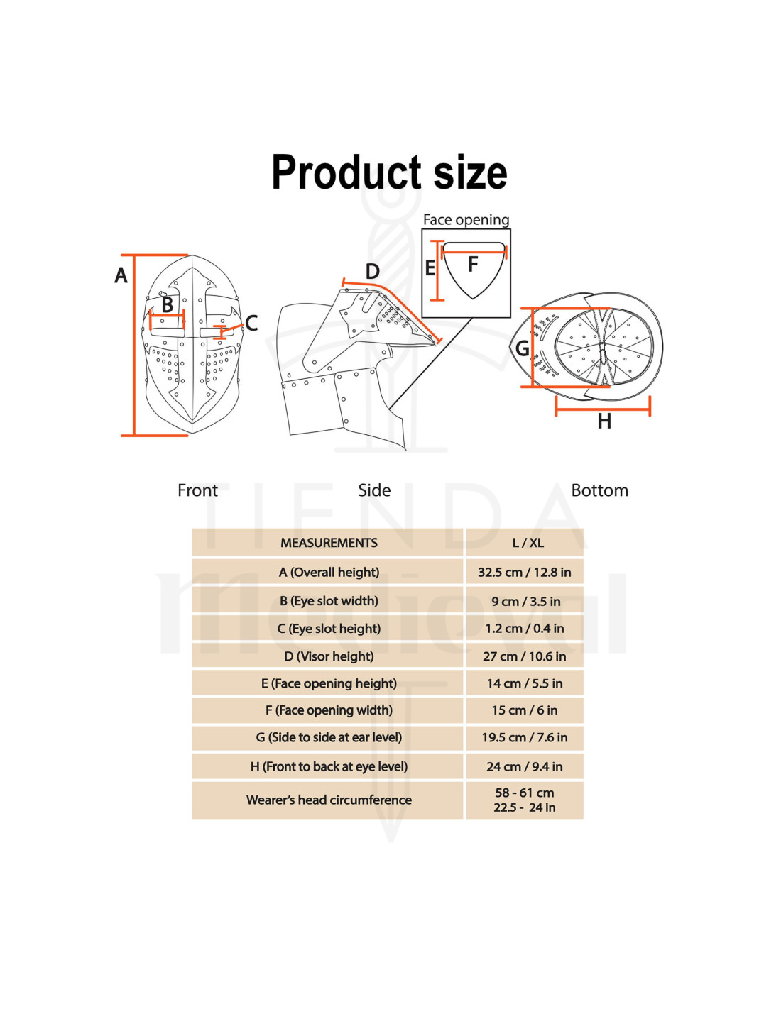 Este bacinete medieval com viseira cavaleiro século XIV, acabamento ennegrecido oferece proteção completa do rosto sem sacrificar o conforto, graças a uma viseira basculante que permite controlar a visibilidade e a ventilação em cada movimento. O design com fenda horizontal de visão e perfurações circulares assegura que você possa manter a vantagem tática, respirando com facilidade enquanto mantém uma linha visual segura.