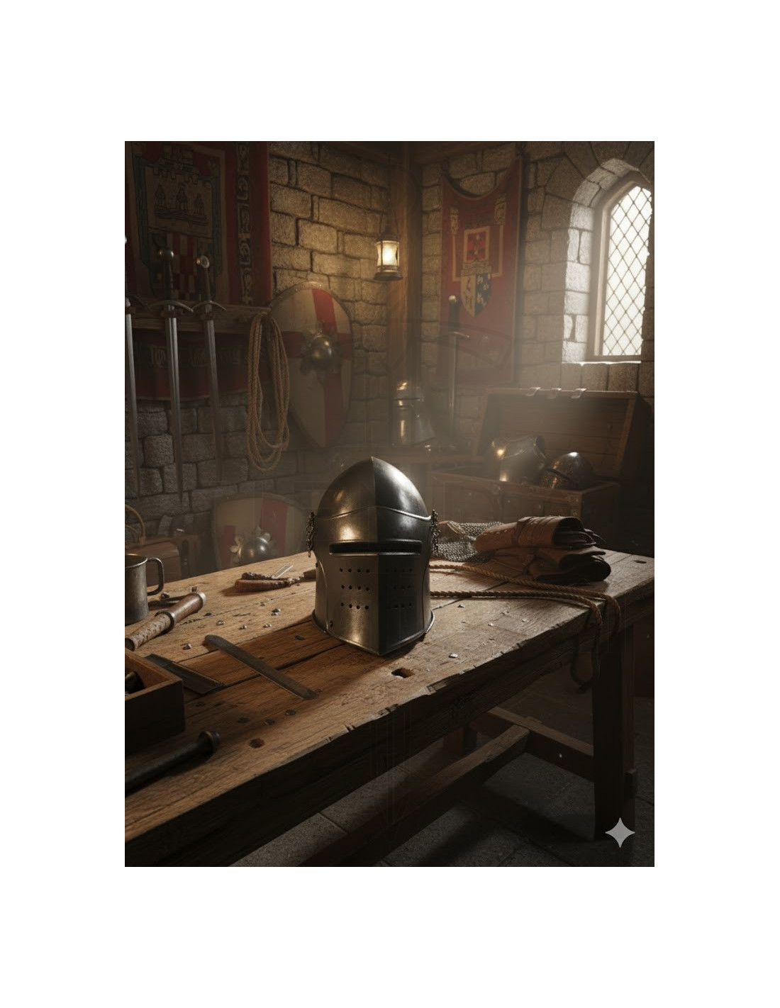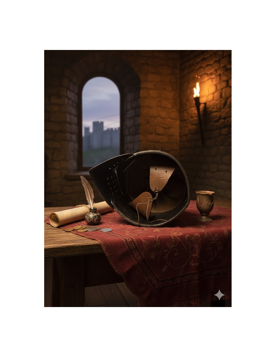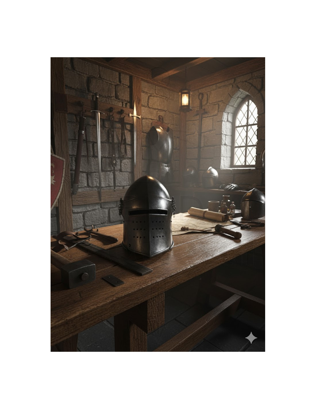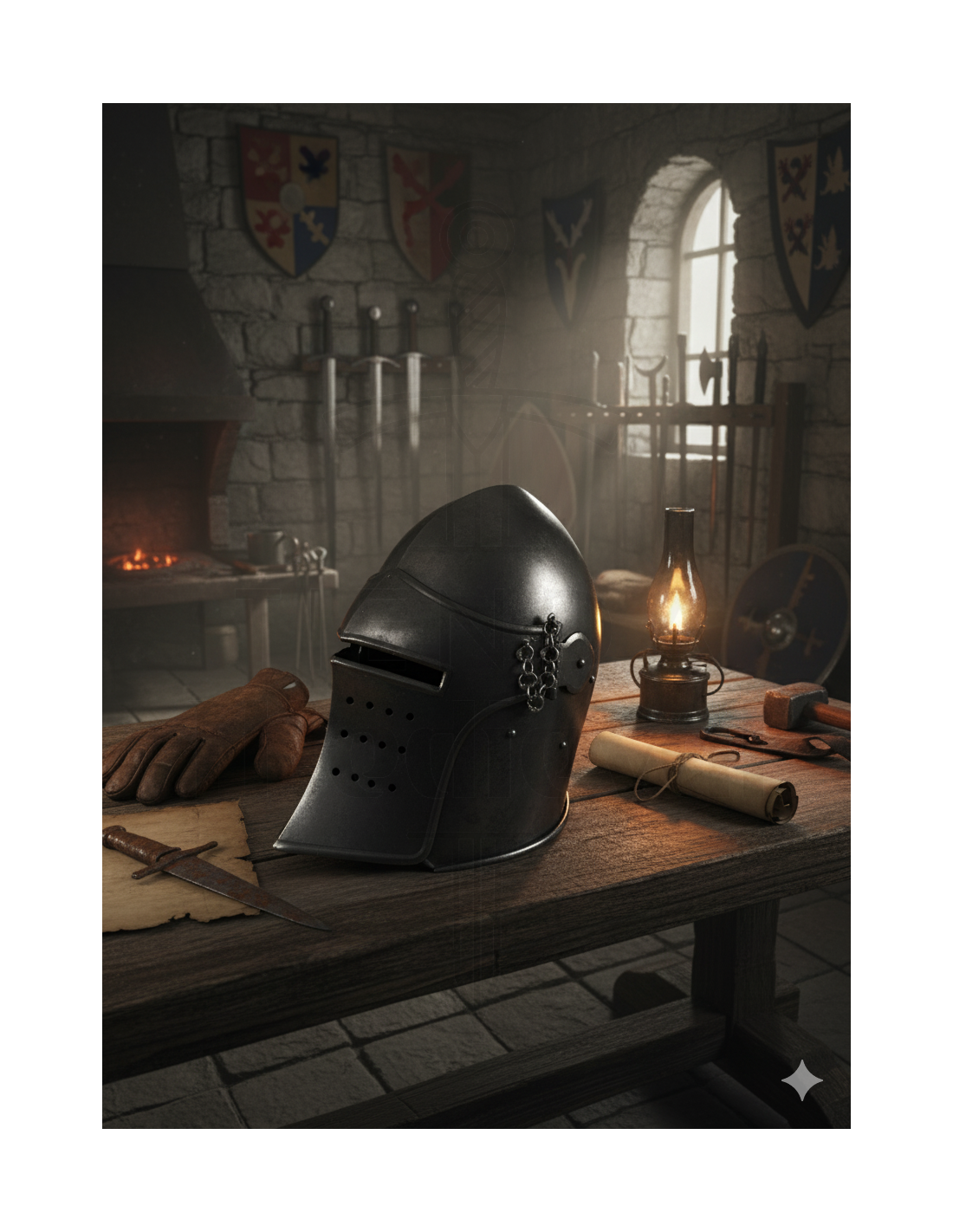 O design toma como referência modelos do século XIV. A forma do bascinet e a estrutura da viseira se inspiram em diversas obras históricas, como uma pintura de 1407–1408 de Spinello Aretino, o fresco da câmara Affresco Pinta em Spoleto (Itália) e o manuscrito “La prima deca” de Tito Lívio (c. 1373), preservado na Biblioteca Ambrosiana de Milão. O resultado é uma recriação visualmente poderosa, perfeita para destacar em qualquer espaço decorativo.