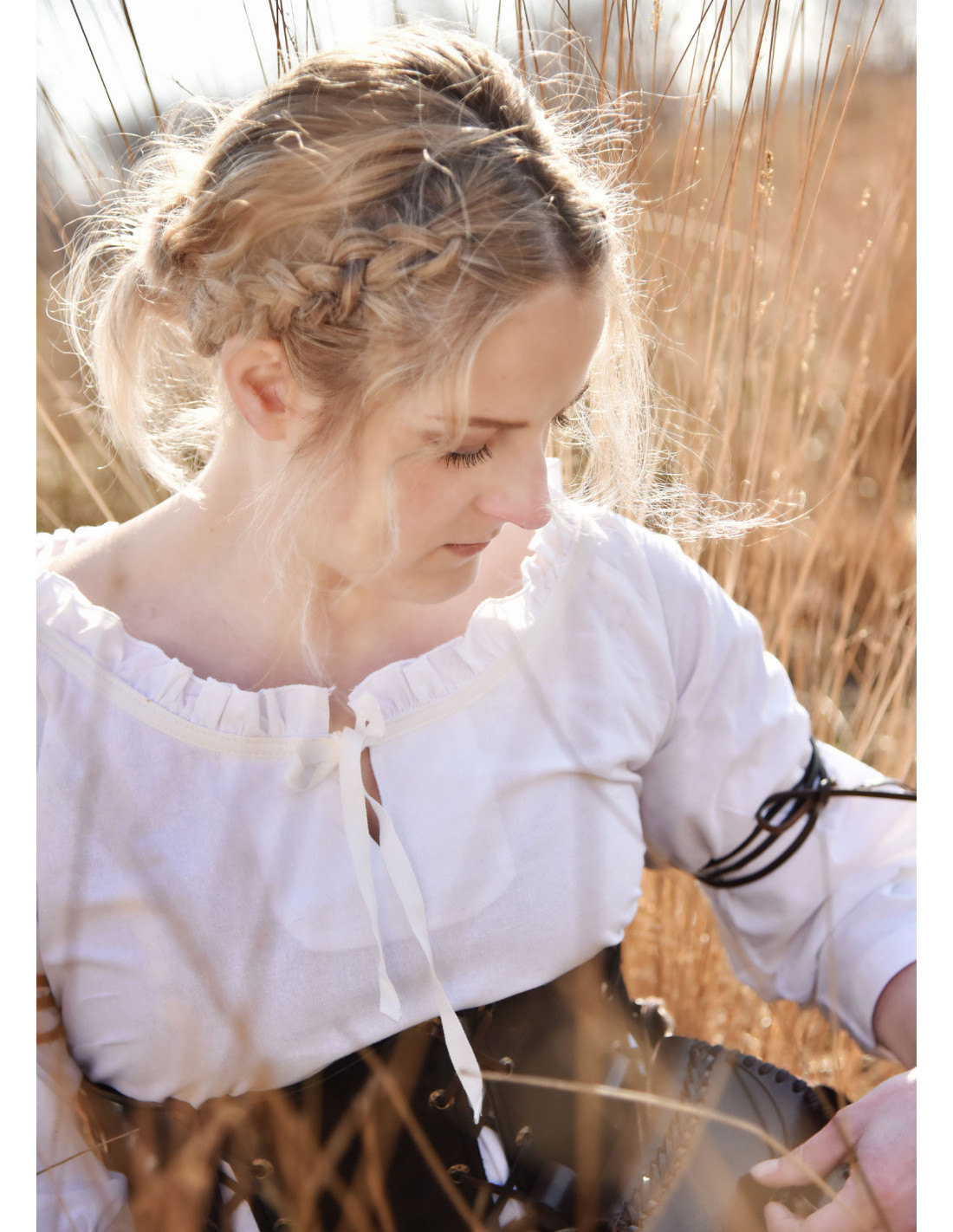 Descubra a elegância e o estilo da blusa medieval para mulher modelo Birga em branco. Confeccionada em algodão leve, essa blusa é sinônimo de praticidade e conforto. Seu design cuidadosamente elaborado é inspirado na moda medieval, tornando-o uma peça única e muito especial.