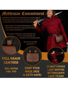 Mythrojan, renomado fabricante americano de roupas e acessórios históricos e fantásticos, criou esta bolsa com grande atenção aos detalhes e usando materiais da mais alta qualidade. O seu design medieval e a sua cor castanha conferem-lhe um aspeto autêntico e elegante.