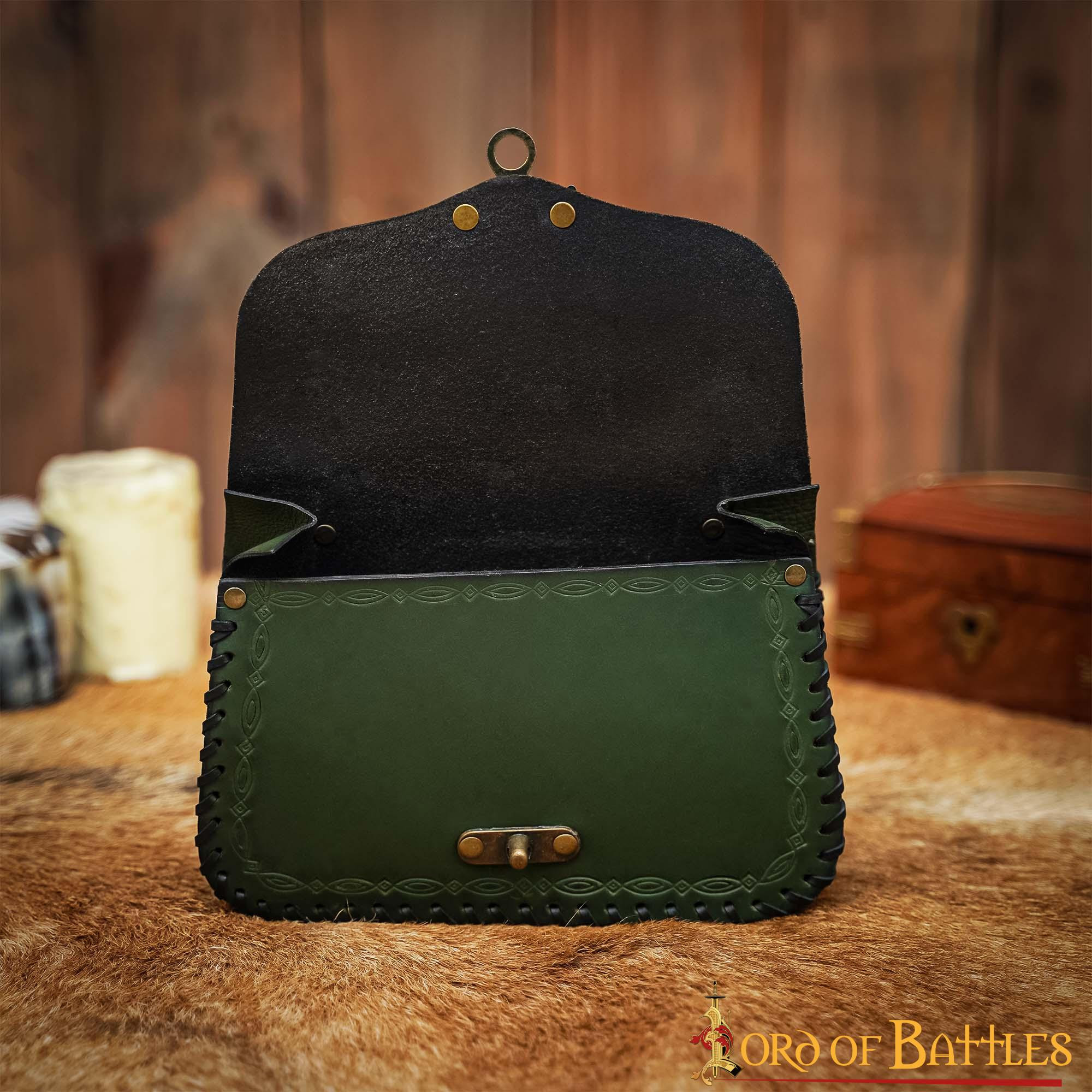 - Elegância em Pele Verde: Imagine carregar a essência da natureza em suas mãos. Esta bolsa é feita de couro de alta qualidade em um fascinante tom de verde, evocando a magia das florestas antigas e das terras dos feiticeiros. O couro não apenas garante durabilidade, mas também conecta você à autenticidade e à história dos tempos medievais.