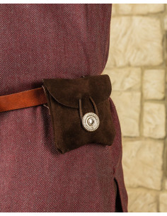 Bolsa medieval, tipo pochete, em couro camurça (13,9x12,9 cm.)