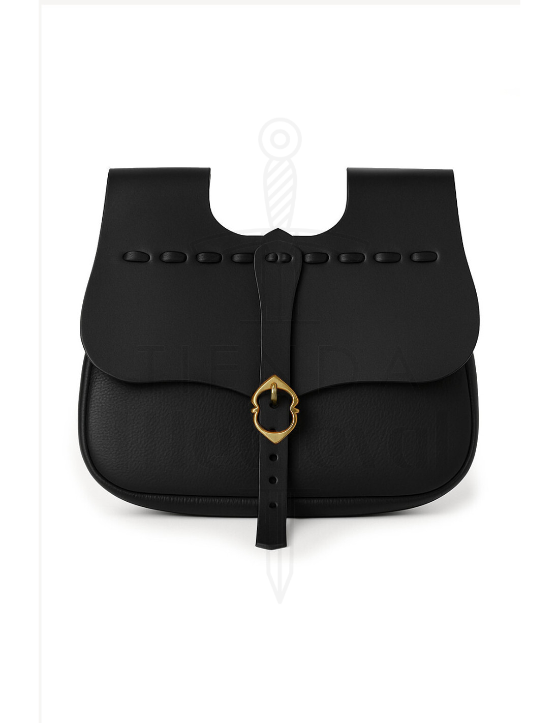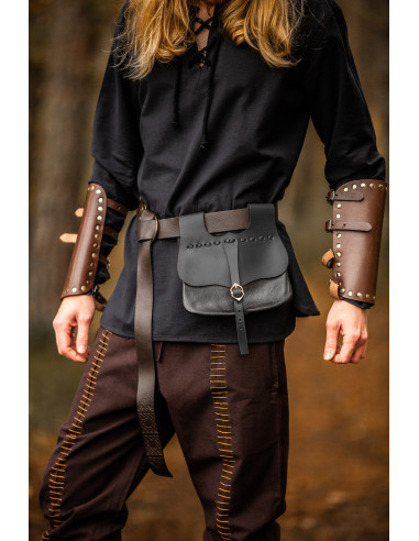Com um design inspirado nas bolsas usadas durante a Idade Média, esta pochete não só reflete um caráter histórico, mas também oferece a praticidade de se prender confortavelmente a cintos de até 5 cm de largura graças às suas duas presilhas. Seu acabamento em couro preto, de textura suave e elegante, garante durabilidade e um visual sofisticado em cada uso. A aba curva decorada com costuras e o fecho com fivela metálica dourada proporcionam um toque distintivo que combina autenticidade e estilo moderno.