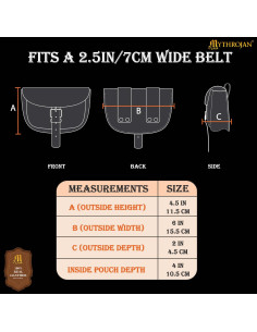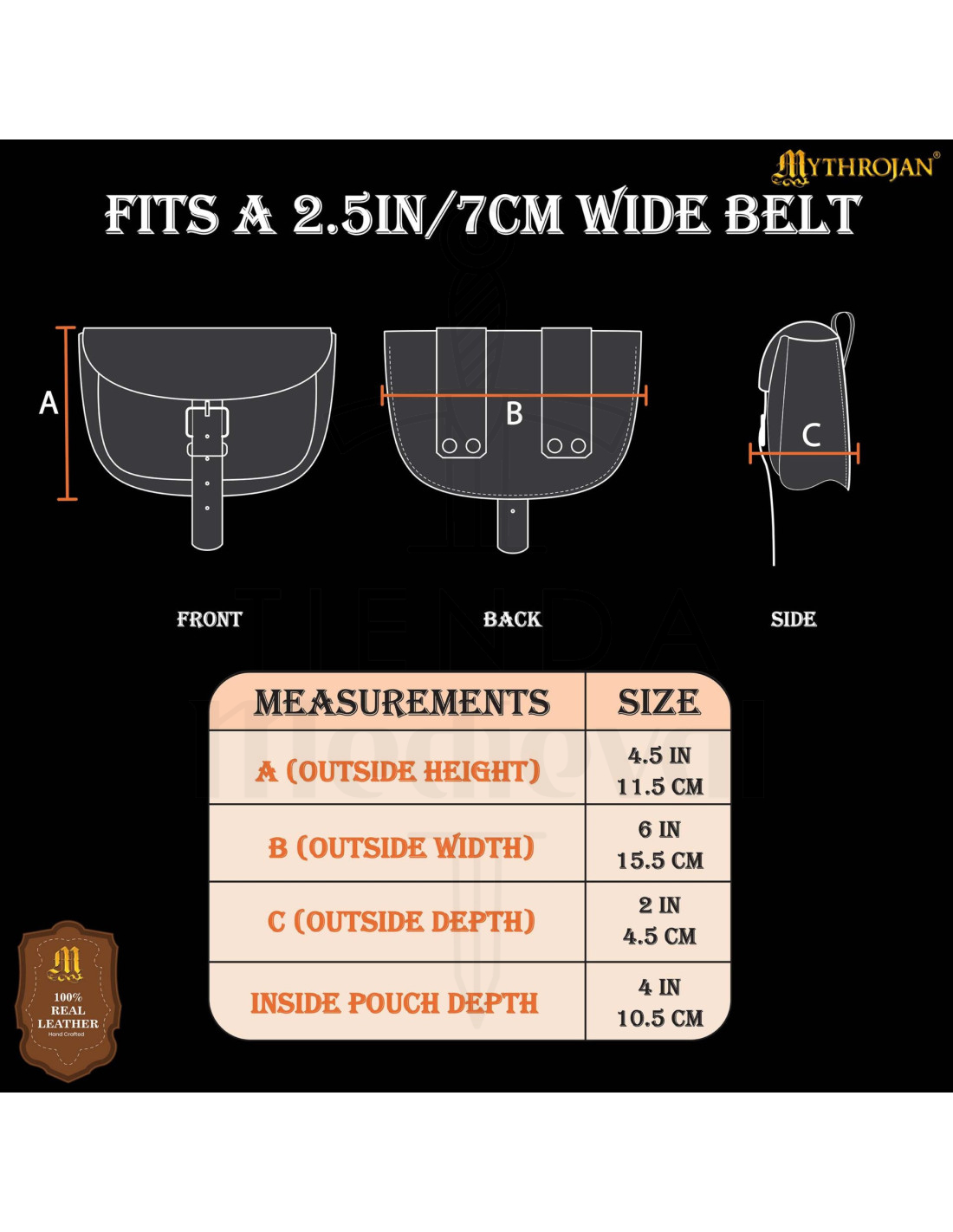 O fecho combina um broche metálico central, visível e fácil de usar, com uma tira frontal ajustável por uma fivela de tom dourado envelhecido, proporcionando dupla segurança e possibilidade de regulagem para que nada se mova durante o uso. As tiras resistentes permitem uma fixação segura a cintos largos, adaptando-se a roupas de estilo viking, mercador ou renascentista sem perder estabilidade.