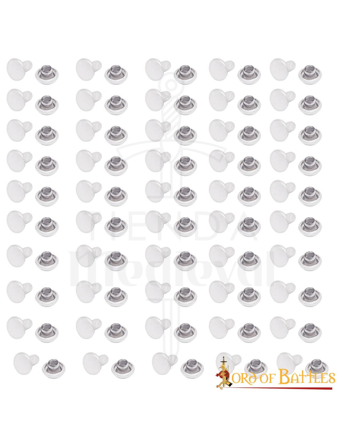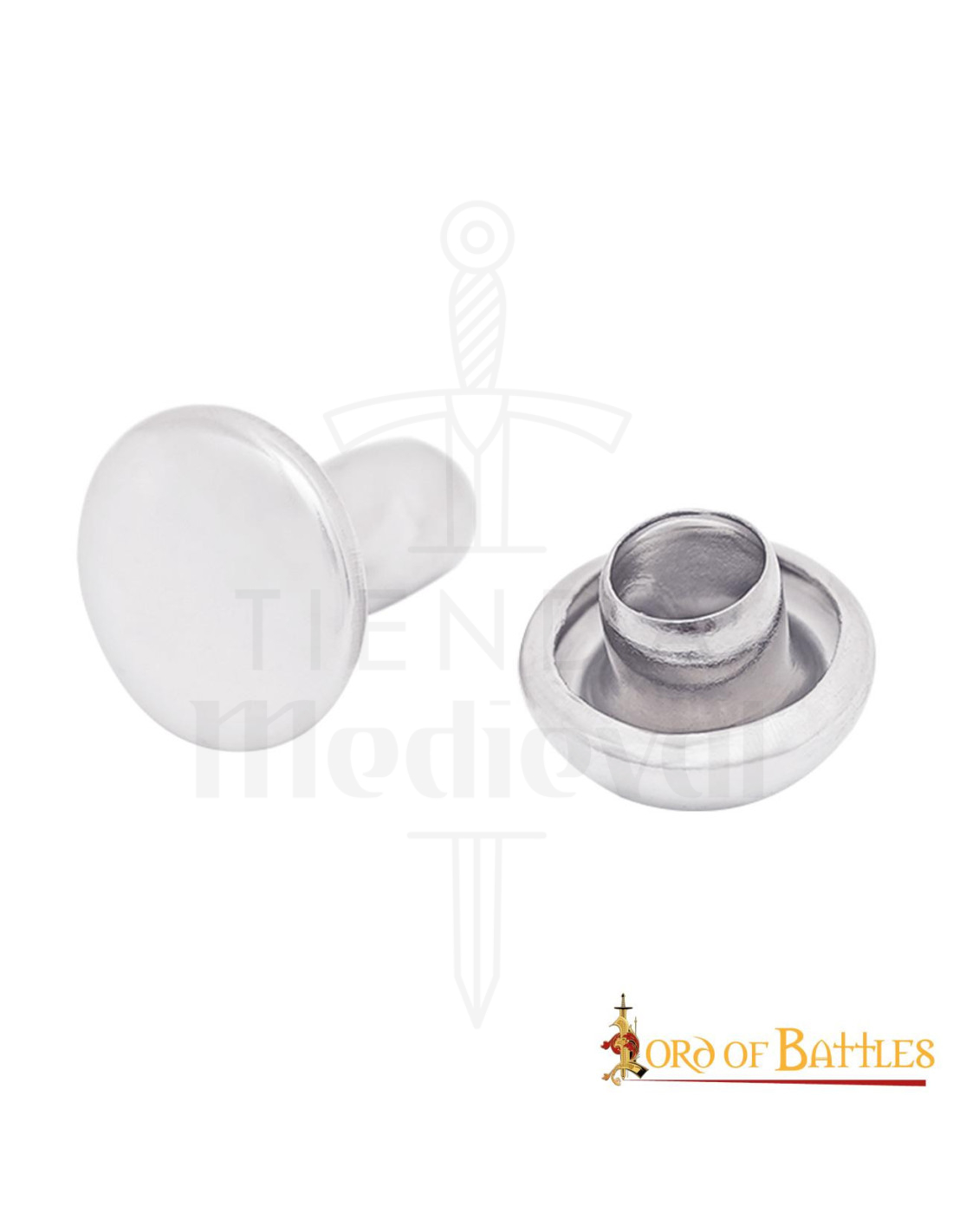 Se você deseja comprar o Pacote de 50 rebites decorativos medievais de aço 7mm, está escolhendo uma solução prática que melhora a apresentação e a resistência de suas obras, enquanto impulsiona sua criatividade. A imagem mostra um par de rebites metálicos de forma redonda, visualizando claramente como encaixam ambas as peças e como ficam sobre o material, o que ajuda você a imaginar o resultado final antes de colocá-los.