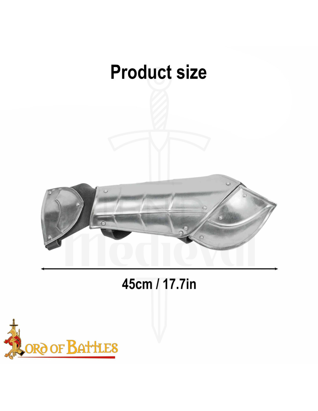 Esses braçadeiras combinam um acabamento prateado polido com placas articuladas, o que resulta em uma presença elegante e em uma mobilidade natural que permite atacar, desviar e gesticular sem restrições. O design segmentado atua como uma segunda pele, protegendo desde a parte superior do antebraço até o pulso e parte da mão, enquanto os reforços nas zonas críticas protegem as articulações sem atrapalhar seu ritmo.