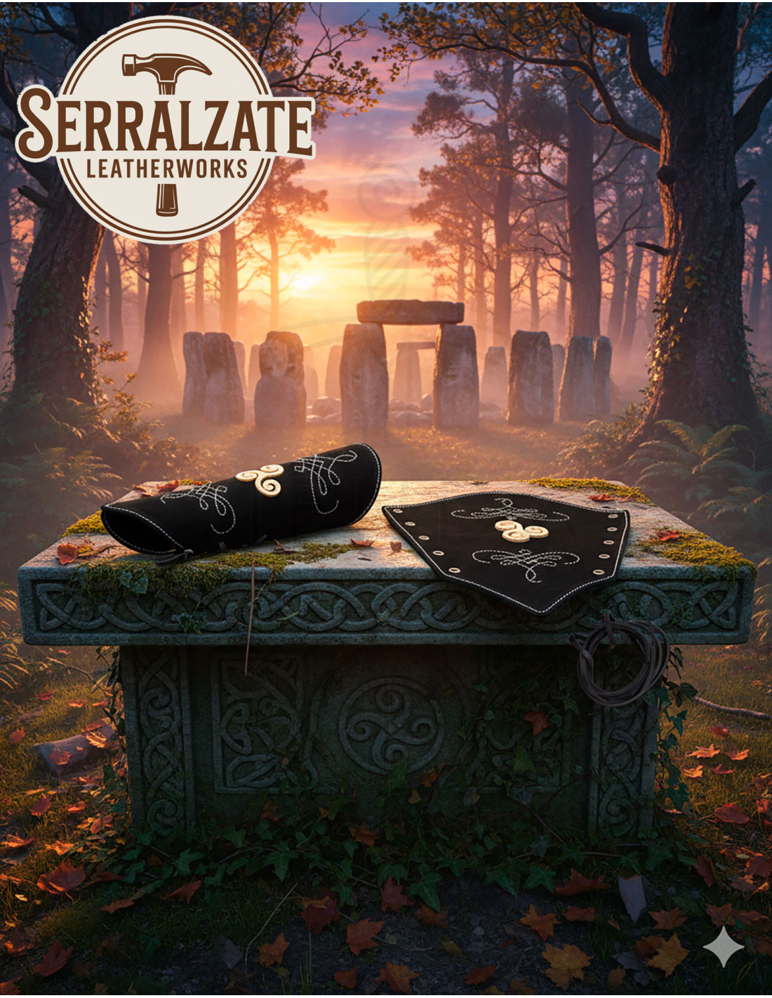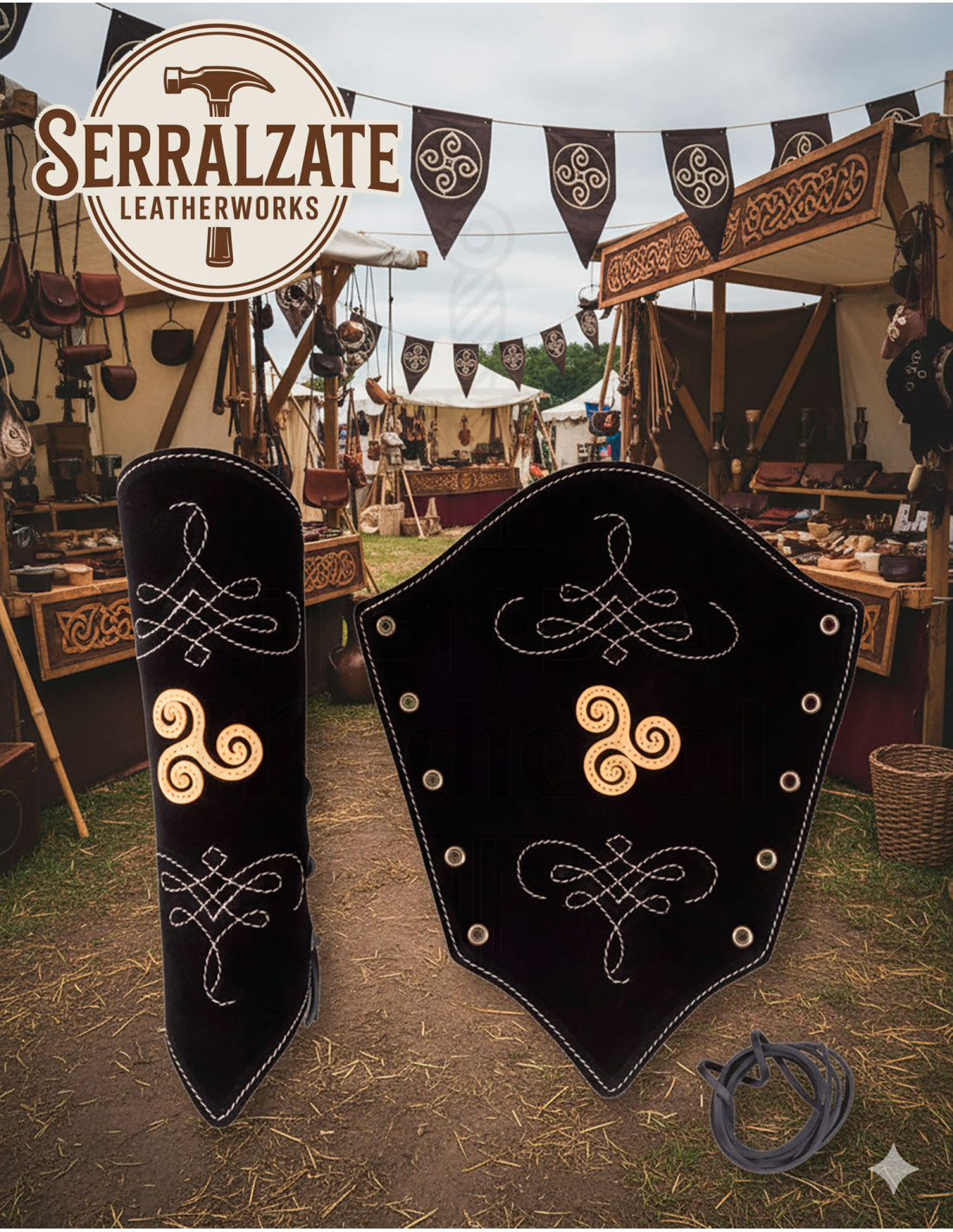 O design único dos Nyara apresenta uma extensão na parte de trás da mão, o que não só lhes confere um toque distintivo, mas também protege e traz um ar de sofisticação. A bordadura elaborada e as decorações finas enriquecem sua aparência, tornando-os um acessório visualmente atraente. Um dos elementos mais destacados é o triskele artisticamente projetado, que está cuidadosamente costurado no centro dos brazaletes, simbolizando movimento e crescimento, e que adiciona um caráter especial a cada peça.