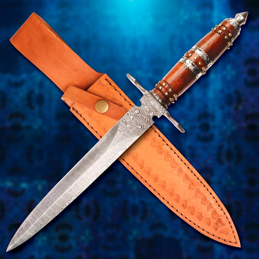 O cabo escurecido da adaga é decorado com duas faixas de prata delicadamente incrustadas, adicionando um toque de classe. Além disso, possui 50 miniaturas de pregos com cabeças de latão, que destacam ainda mais sua beleza e originalidade.