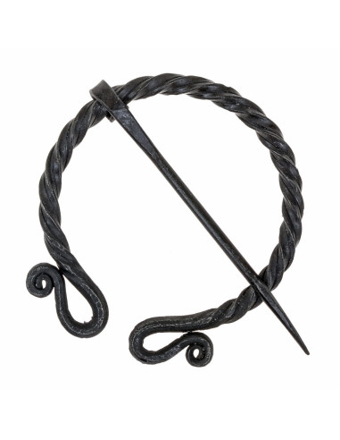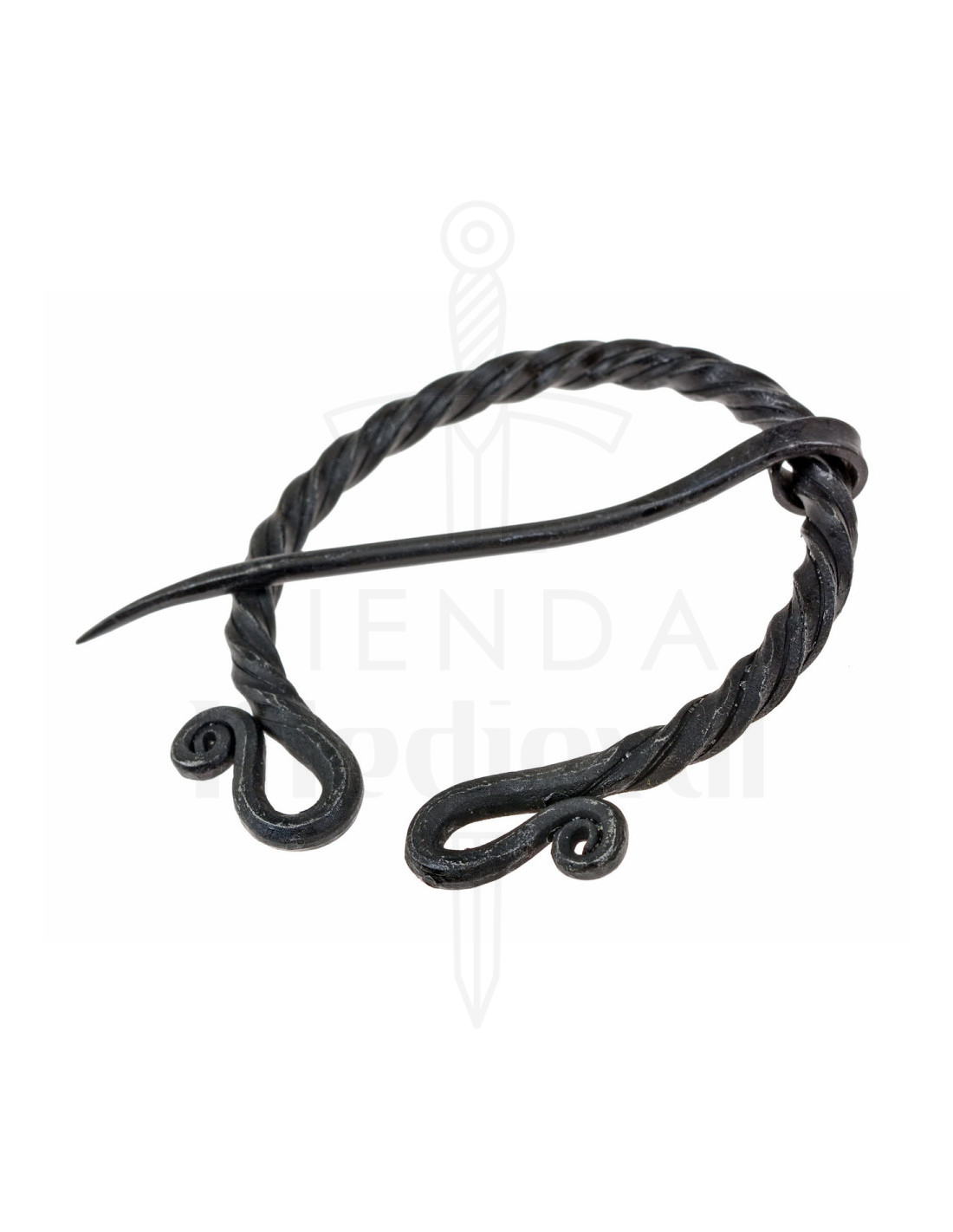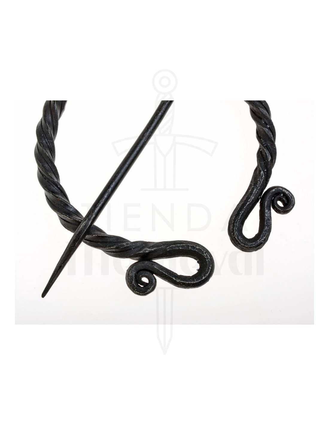 Esta peça forjada à mão apresenta um aro formado por duas hastes torcidas que desenham uma ômega perfeita, rematadas em espirais decorativas, e uma agulha longa que desliza pelo interior do aro para um fechamento limpo e firme. A superfície fosca em tom preto e a textura levemente áspera reforçam essa presença rústica, ideal para quem busca um acessório com caráter que não chame a atenção de forma ostentosa.
