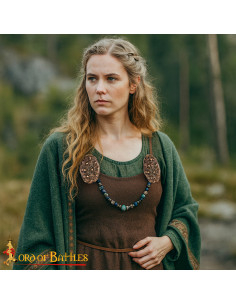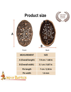 Com um design muito elaborado, apresenta um proeminente boss central, rodeado de entrelaçados de nós e delicados detalhes em contas que refletem a maestria artesanal da época. A forma oval e o alto relevo conferem um caráter imponente, ideal para prender com estilo vestidos ou túnicas vikings, geralmente em pares e complementados com correntes decorativas. A perfeição no casting garante um acabamento preciso e duradouro, tornando-o uma peça única para colecionadores, roupas de época ou decoração temática.