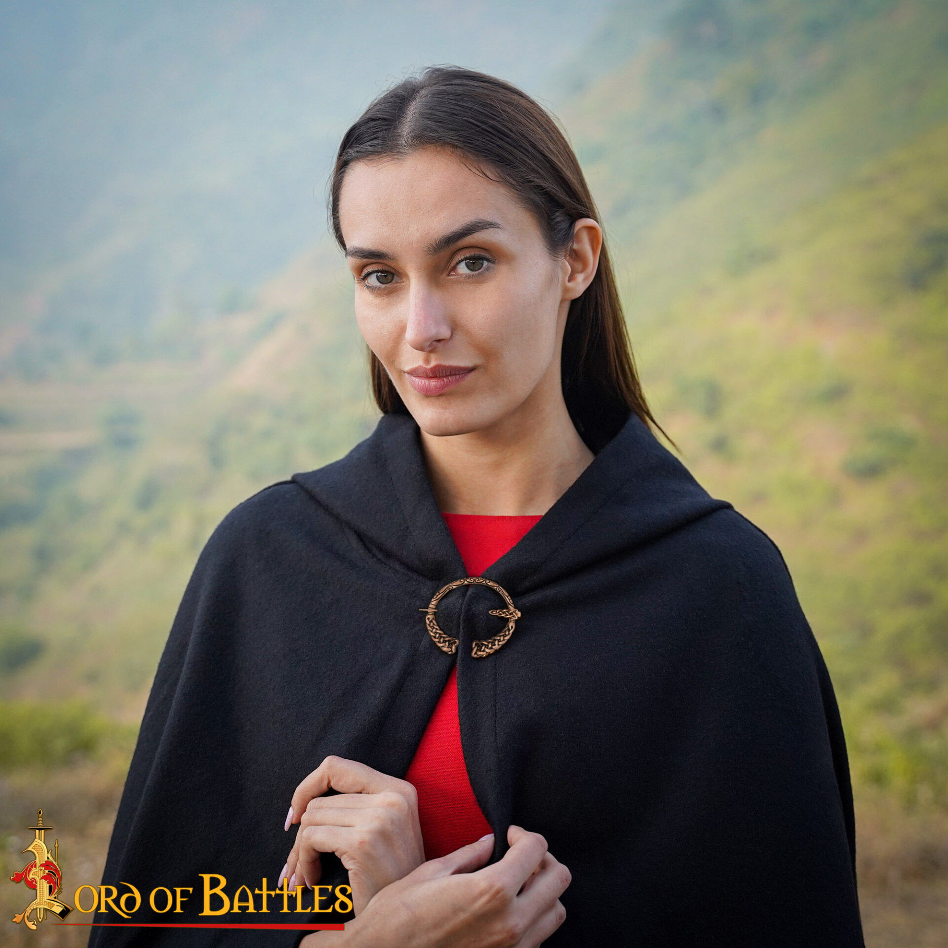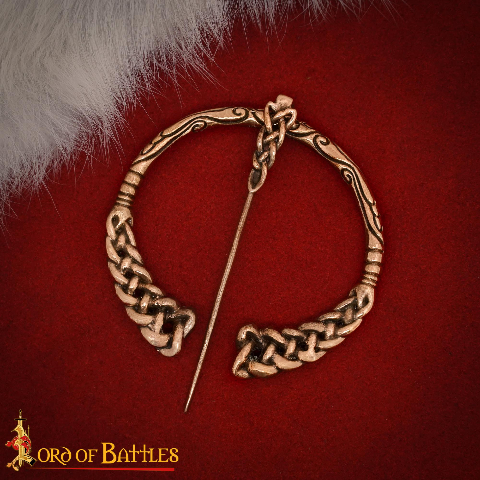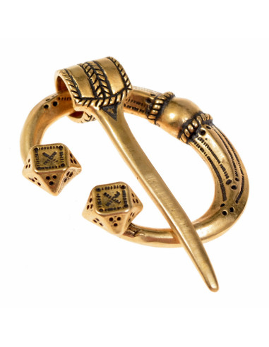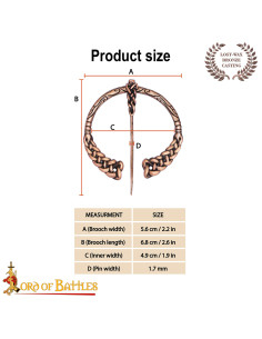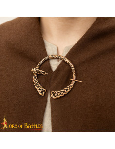 O design entrelaçado atrai o olhar e, mais importante, assegura o fechamento com confiança: o alfinete reto desliza em seu suporte para manter túnicas e capas onde devem estar, sem complicações. O acabamento em bronze envelhecido oferece uma aparência autêntica que envelhece com seu uso, dando caráter e elegância tanto em recriações históricas como em looks diários.
