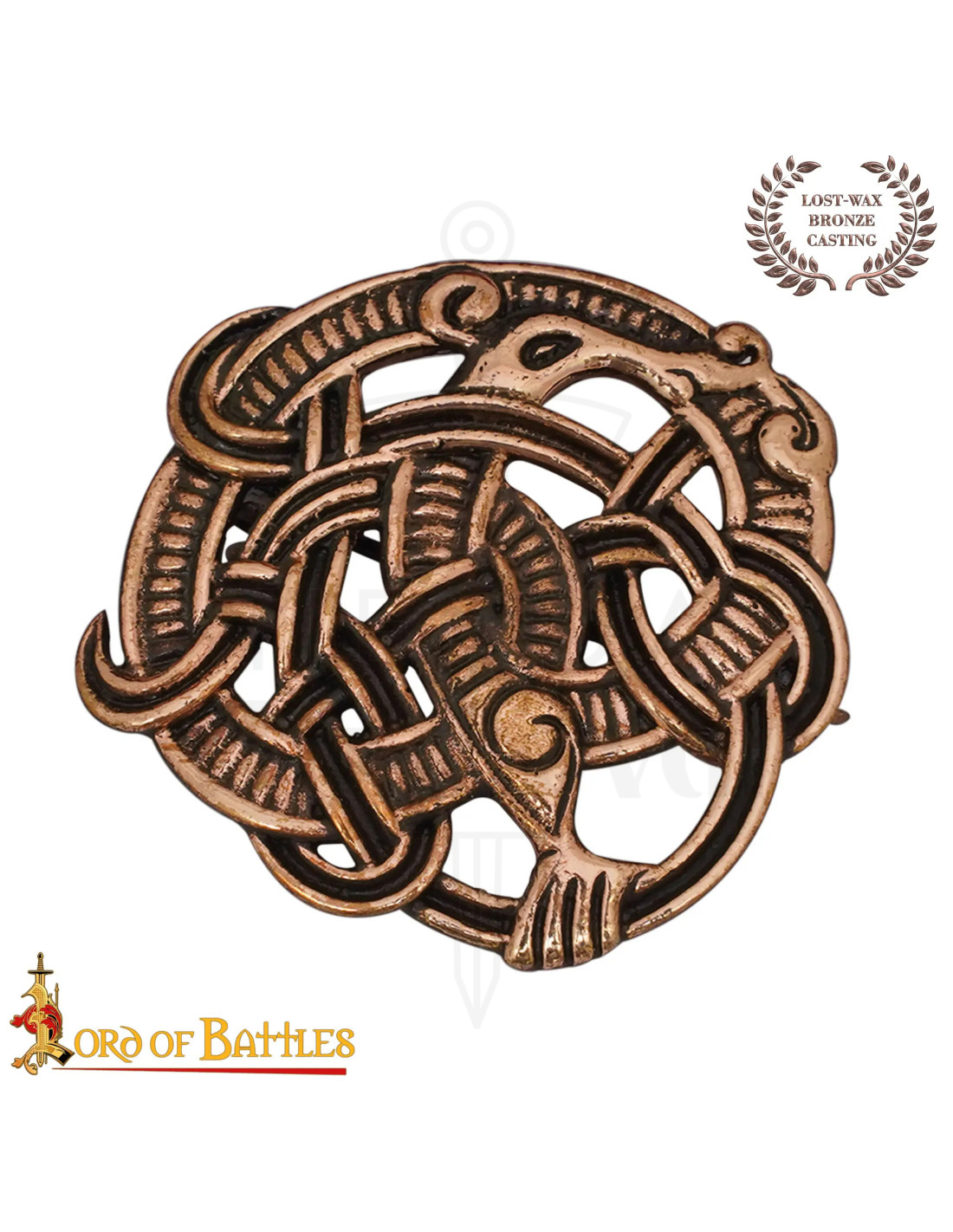 Este broche nasce de uma tradição ancestral, criado através da técnica de cera perdida, o que garante que cada exemplar seja único e conserve os detalhes finos que recriam motivos dos séculos IX ao XI. As figuras animais entrelaçadas e as linhas gravadas proporcionam uma textura viva, enquanto o brilho e as áreas com pátina realçam os relevos, oferecendo um aspecto envelhecido que conta histórias em cada reflexo.
