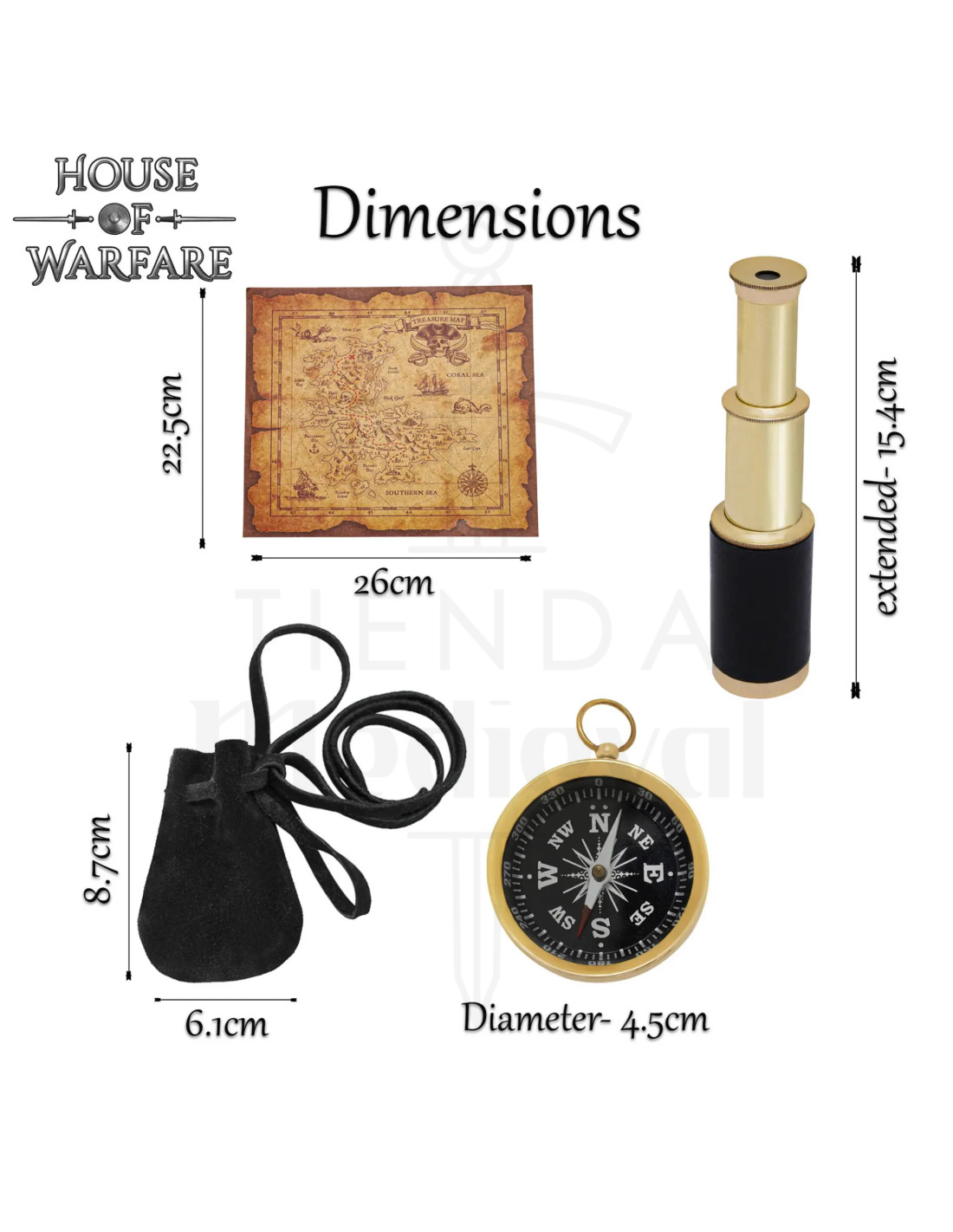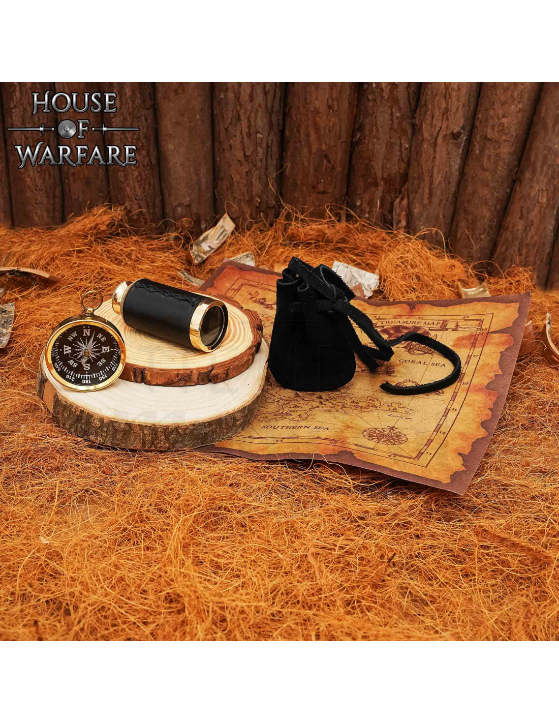 Este conjunto reúne tudo que você precisa para viver missões memoráveis: uma bússola com borda dourada que transmite confiança ao se orientar, um telescópio metálico com acabamento dourado e detalhes pretos que transforma o reconhecimento do terreno em um gesto digno de um explorador, e um mapa de aparência envelhecida que convida a traçar histórias entre ilhas, linhas de coordenadas e uma rosa dos ventos decorativa. A bolsa de tecido preta com cordão protege os elementos, facilitando levá-los e preservá-los como uma peça de coleção.