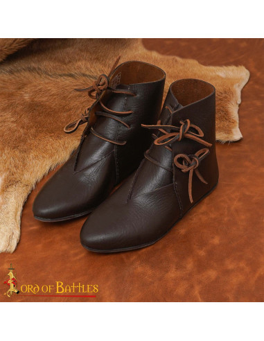 Estes Botins medievais de couro marrom com cadarços laterais reproduzem fielmente os turnshoes históricos, oferecendo uma estética autêntica que completa qualquer traje de recriação, LARP ou festival renascentista. O couro genuíno e as costuras visíveis não apenas falam de tradição, mas se traduzem em uma flexibilidade e moldagem que acompanha o pé durante longas jornadas, sem abdicar de uma imagem fiel e cuidada.
