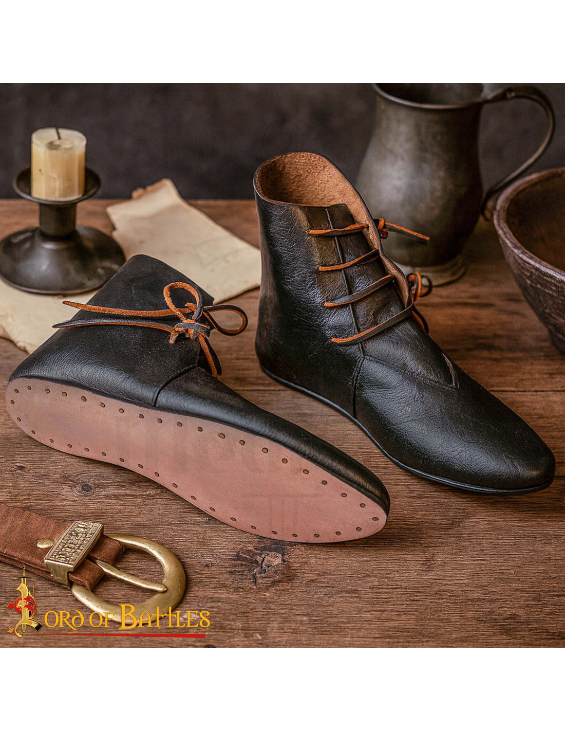 Palavras-chave úteis ao decidir: comprar Botins medievais em couro preto com cadarços laterais, comprar Botins medievais em couro preto com cadarços laterais para recreação histórica, venda Botins medievais em couro preto com cadarços laterais. Este par transforma sua indumentária em uma representação fiel, confortável e pronta para a ação.