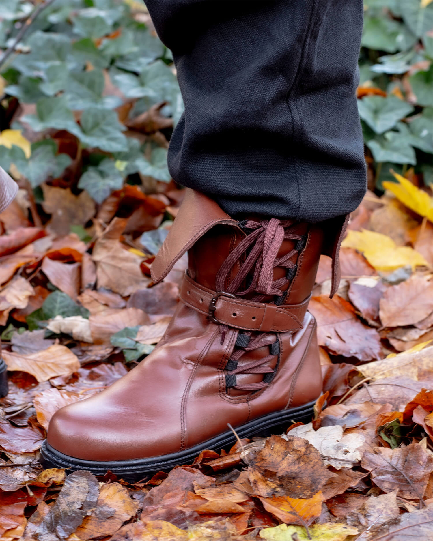 As Botas medievais em couro modelo Dawson, cor marrom combinam presença histórica com a robustez de um calçado pensado para o exterior. O acabamento exterior brilhante e as costuras reforçadas não apenas trazem estética, mas protegem as áreas mais expostas, para que o uso contínuo não comprometa a aparência. O fechamento com cadarços permite ajustar o calce de forma fácil e rápida, enquanto a tira com fivela acrescenta suporte extra, traduzindo-se em passos mais estáveis e confiança ao se mover sobre terrenos desnivelados.