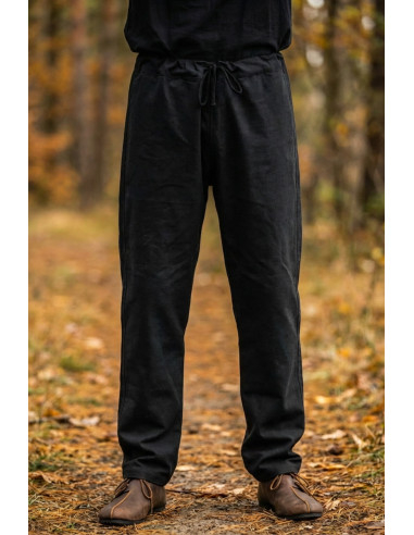 A ausência de bolsos visíveis reforça um acabamento limpo e autêntico, perfeito para quem busca uma estética fiel a épocas passadas sem renunciar à praticidade. A cor preta aumenta a versatilidade, combinando com túnicas, capas e camisas de diferentes tons, e ainda ajuda a manter uma aparência cuidada durante múltiplos usos.