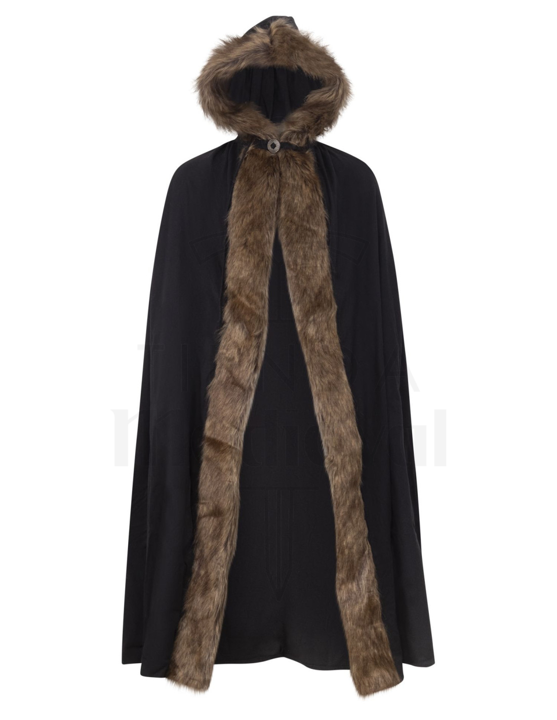 Está procurando uma peça que combine estilo e funcionalidade nos seus momentos mais especiais? Nossa capa medieval de algodão modelo Aaron na elegante cor preta é exatamente o que você precisa para se destacar com sofisticação. Graças ao seu design circular, ela possui um capuz profundo que irá protegê-lo do vento e da chuva, além de um fechamento simples no pescoço com botão que acrescenta um toque clássico e prático.