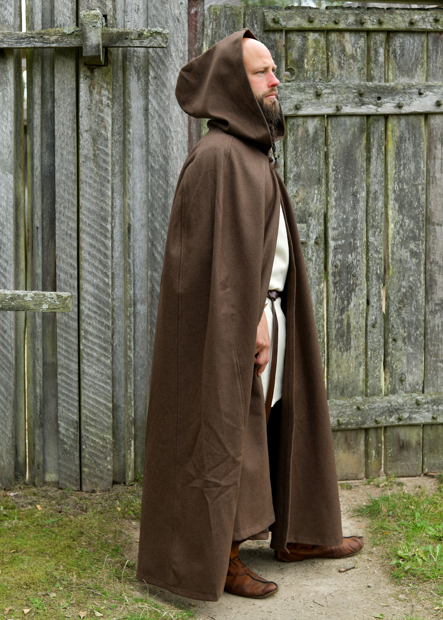 La capucha amplia funciona como un refugio práctico, protegiendo del frío y de la brisa sin perder el estilo, y el cierre frontal con botón de madera añade un punto de autenticidad, facilitando ponerse y quitarse la capa con rapidez durante ferias o recreaciones. Todo ello pensado para que luzcas convincente y te sientas cómodo durante largas jornadas.