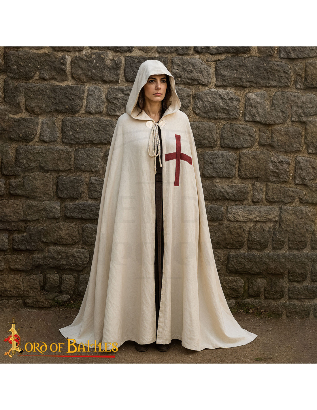 A grande cruz vermelha no peito não é apenas um adorno, mas um símbolo visual que transmite hierarquia e pertencimento, ideal para quem deseja projetar uma figura reconhecível e solene em recriações, teatro ou eventos temáticos. O capuz profundo proporciona cobertura eficaz, mantendo o rosto resguardado e criando essa silhueta icônica de combate ou cerimônia.