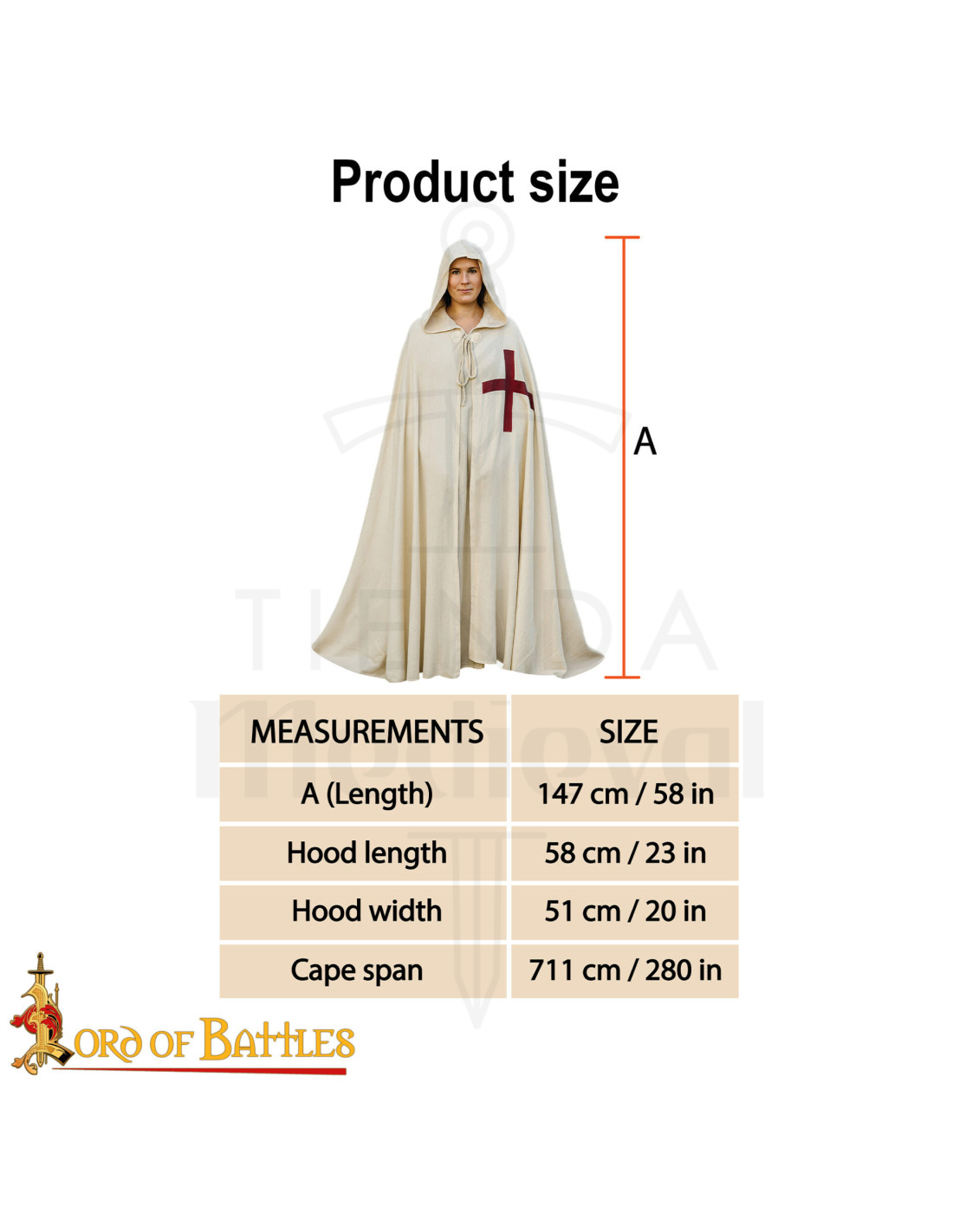 A Capa medieval Cruzado Teutônico século XIII, cor natural combina design histórico com conforto pensado para ser usada o dia todo, oferecendo uma queda ampla que acompanha cada passo e realça qualquer um dos seus trajes de época. O tecido resistente e de textura áspera protege do vento e do sol, ao mesmo tempo que permite a transpiração, assim a sensação é de autenticidade sem abrir mão do conforto.
